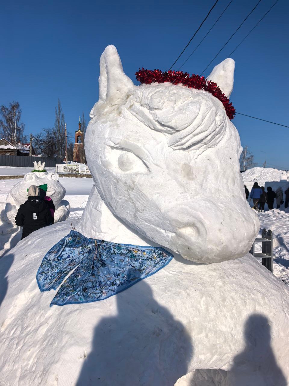 Чтобы сделать из огромного снежного куба лошадку новоиспеченному скульптору Надежде Анатольевне Елькиной и ее подругам по женсовету и творчеству пришлось потрудиться. Три часа пролетели как одно мгновение, и вот гостей праздника и строгое жюри встречал очаровательный символ года!