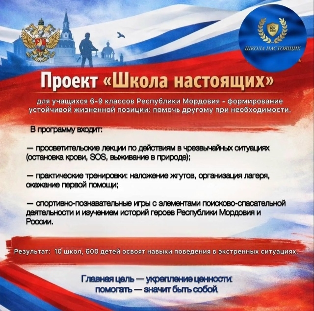 Масштабный проект «Школа настоящих» направлен на формирование у школьников активной жизненной позиции, готовности действовать в нестандартных ситуациях; знакомство с героическими страницами истории родного края и родной страны. Он включает просветительские лекции, практические занятия, спортивно-познавательные игры, выездные экскурсии, встречи с героями нашего времени. Важная цель работы – закрепить в системе ценностей юного гражданина страны понимание, что помогать - это норма, это путь настоящего человека.