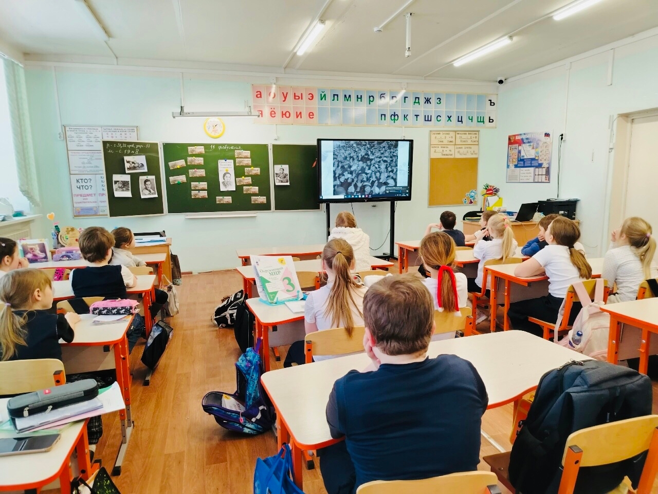 Урок начался с просмотра фильма о легендарной летчице Валентине Гризодубовой. Именно её выступление на митинге в сентябре 1941 года положило начало Антифашистскому комитету советских женщин, который она и возглавила.