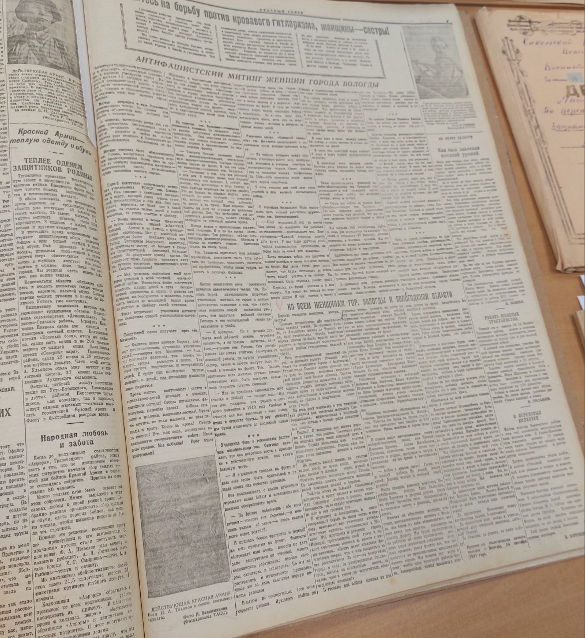 "В архиве хранится номер газеты "Красный Север", где на первой полосе рассказывается о проведении 14 сентября 1941 года Антифашисткого митинга женщин города Вологды. Мы узнали, что местом проведения митинга был областной драмтеатр на улице Октябрьской, сейчас здесь располагается Театр для детей и молодежи. В статье приводятся цитаты из выступлений женщин на этом митинге, рассказывается о том, кто принял в нем участие. Также на первой полосе газеты опубликована принятая на митинге резолюция - обращение ко всем женщинам города Вологды и Вологодской области", - рассказала Валентина Артамонова.