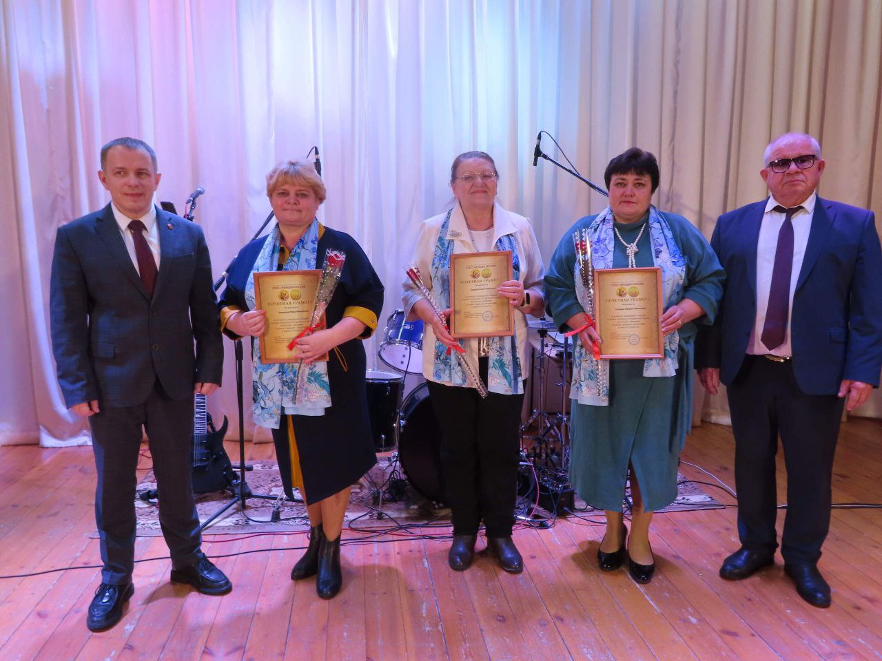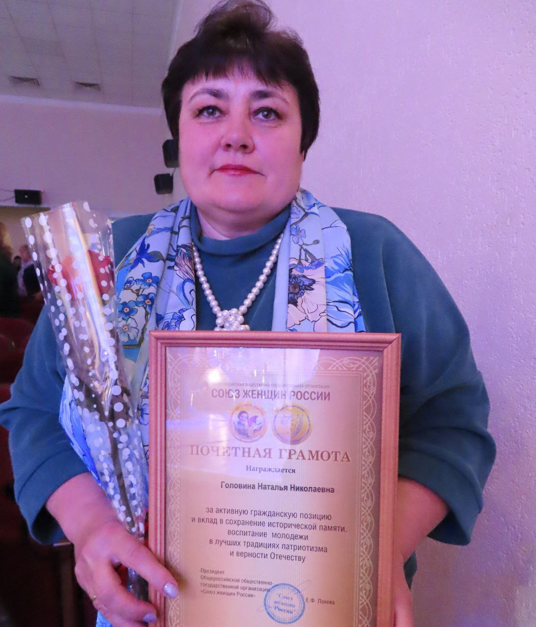 Почетной грамотой Союза женщин России за активную гражданскую позицию и вклад в сохранение исторической памяти, воспитание молодежи в лучших традициях патриотизма и верности Отечеству награждены Елена Черникова, Наталья Головина и Галина Ларина.