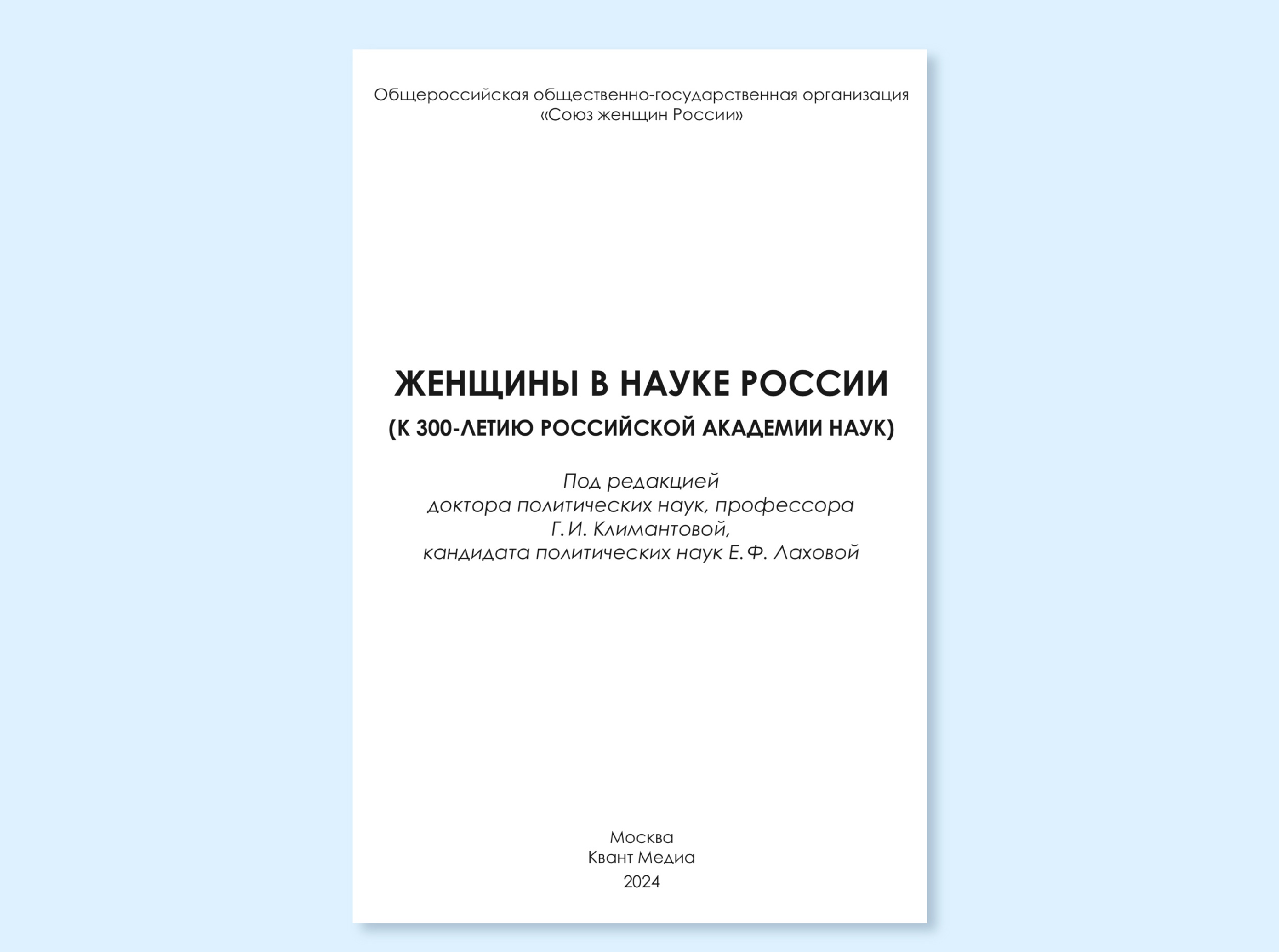 Брошюра "Женщины в науке России (к 300-летию РАН)" под редакцией доктора политических наук, профессора Г.И. Климантовой и кандидата политических наук Е.Ф. Лаховой.