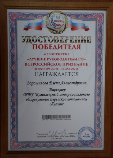 Подведены итоги Всероссийского конкурса «Лучшие руководители Российской Федерации 2020 Всероссийское признание». Одним из победителей стала директор ОГБУ «Комплексный центр социального обслуживания Еврейской автономной области», член регионального отделения «Союз женщин России» в Еврейской автономной области Елена Ворошилова.