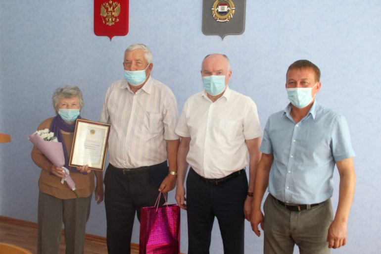 Глава района К.А.Мангутов вручил медали «За любовь и верность», Грамоты Организационного комитета по проведению Дня семьи, любви и верности в Российской Федерации, подарки супругам Виктору Ивановичу и Альбине Николаевне Иноземцевым и Сергею Дмитриевичу и Татьяне Петровне Царевым.