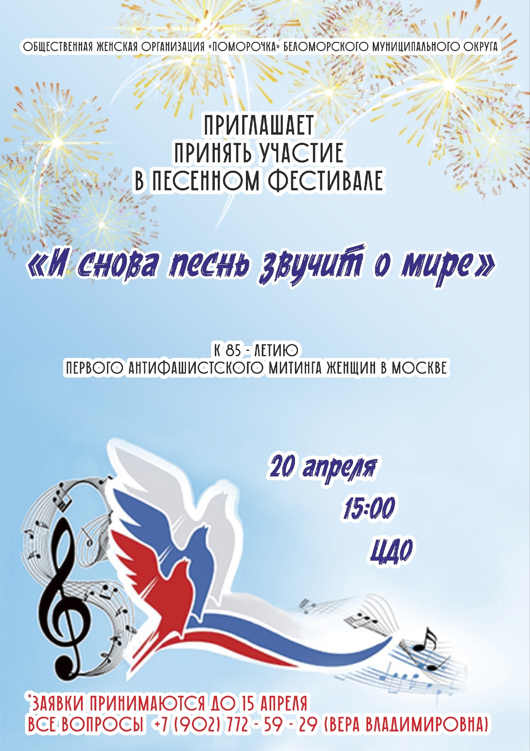 20 апреля местный Центр дополнительного образования станет площадкой для песенного фестиваля «И снова песнь звучит о мире», приуроченного к 85-летию первого Антифашистского митинга женщин.
