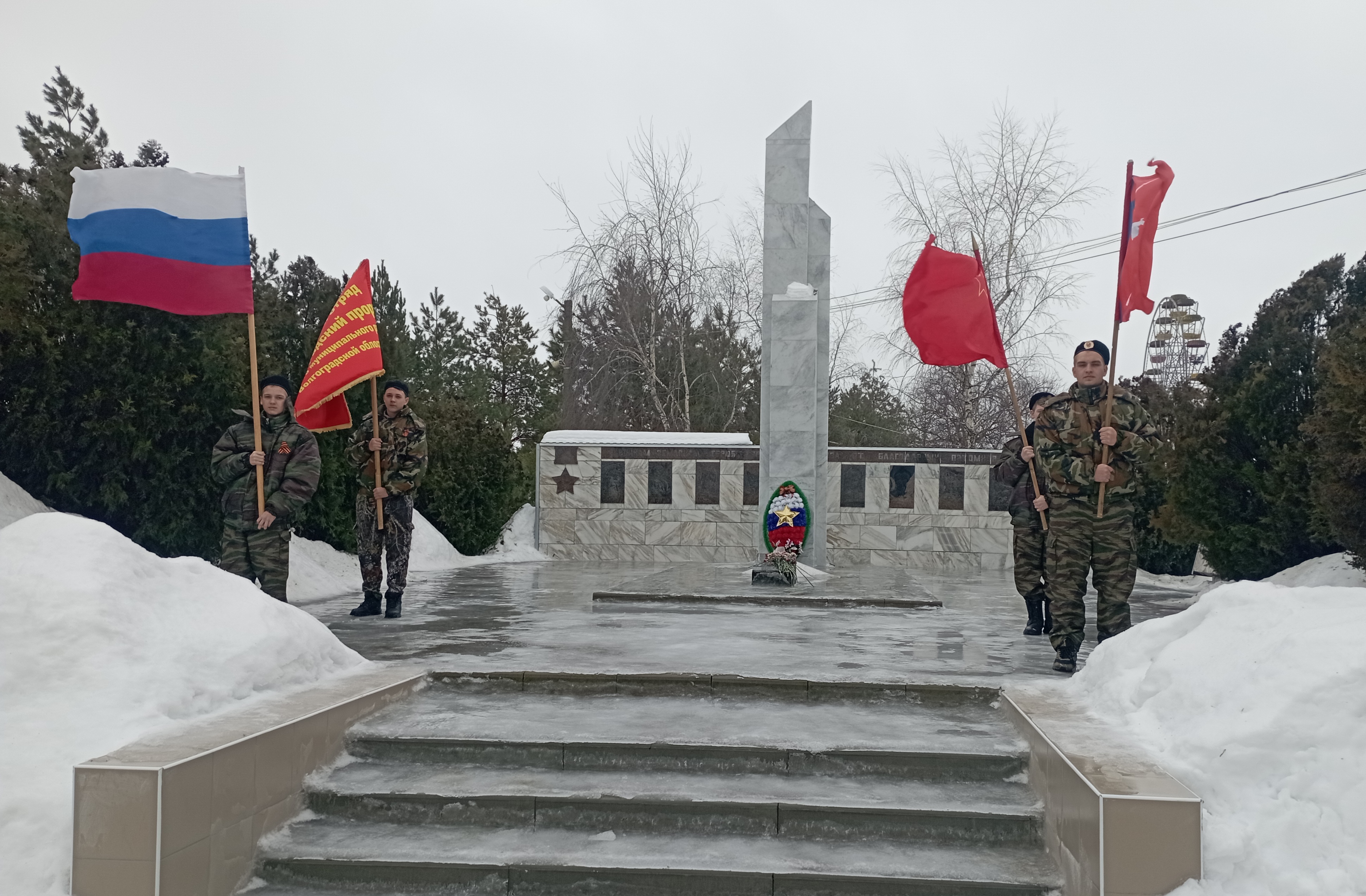 Затем участники мероприятия прошли в Центральный парк и возложили цветы к мемориалу Героям-землякам. Почетный караул у вечного огня несли воспитанники поискового отряда «Сталинградский прорыв».