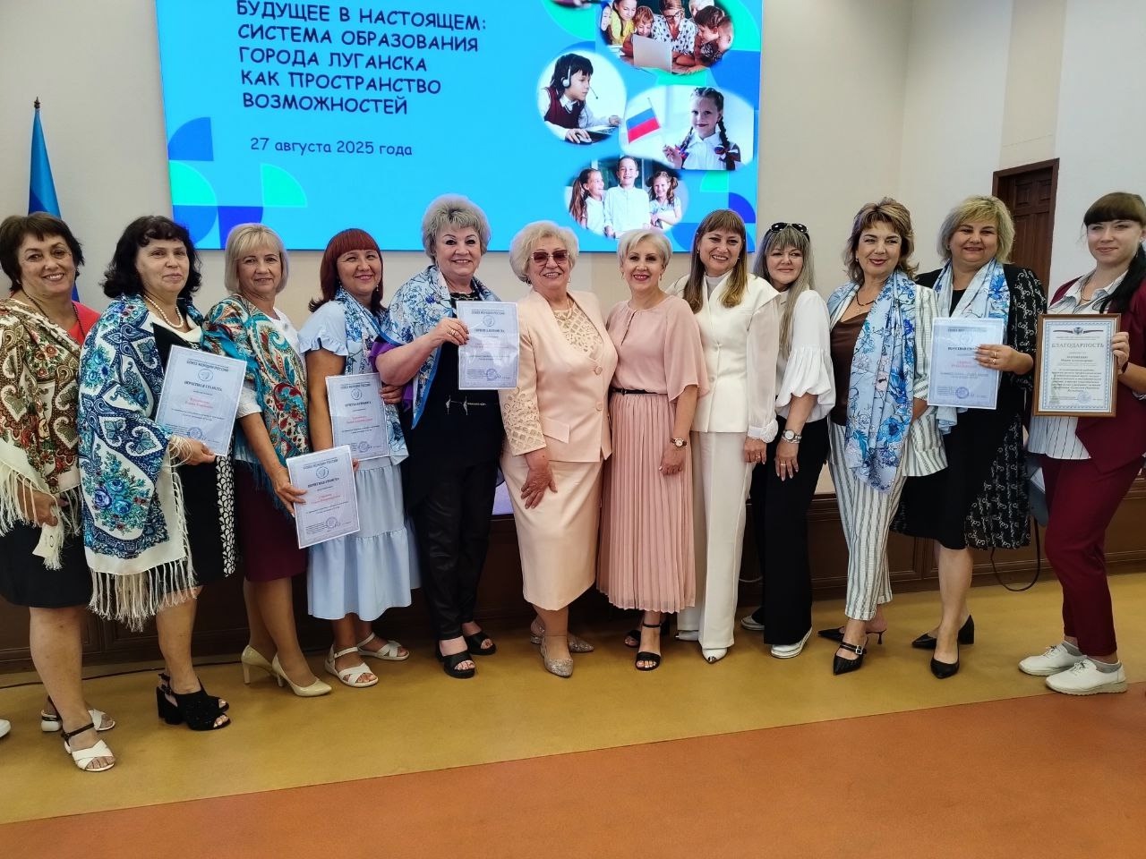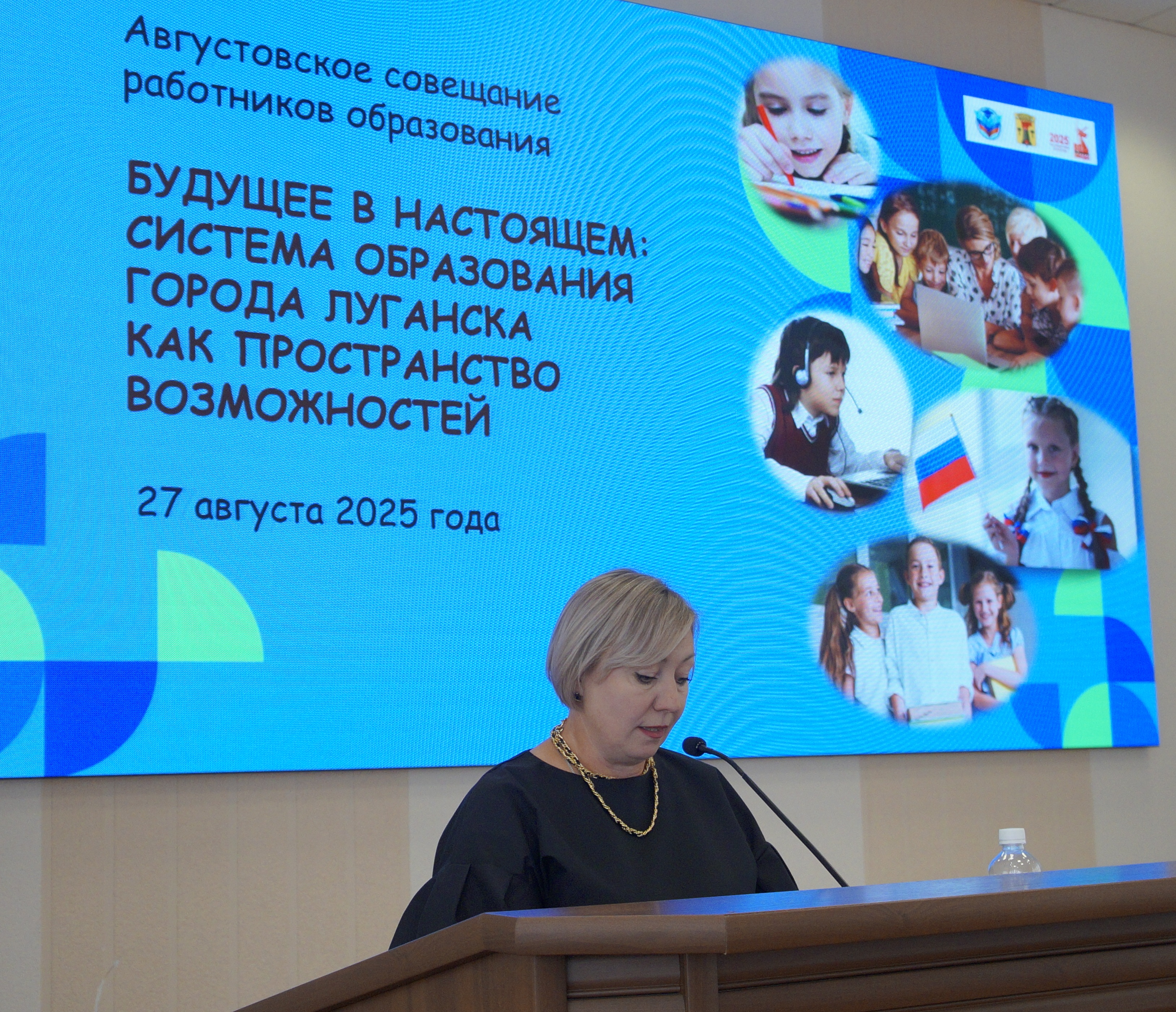 С приветственным словом к руководителям учебных учреждений города обратилась временно исполняющая полномочия Главы Луганска, заместитель председателя Луганского регионального отделения Союза женщин России Яна Валерьевна Пащенко. Она поздравила педагогов с новым учебным годом, пожелала им достойных их усилий учеников, которые станут славой и гордостью родного города и вручила педагогам заслуженные награды.