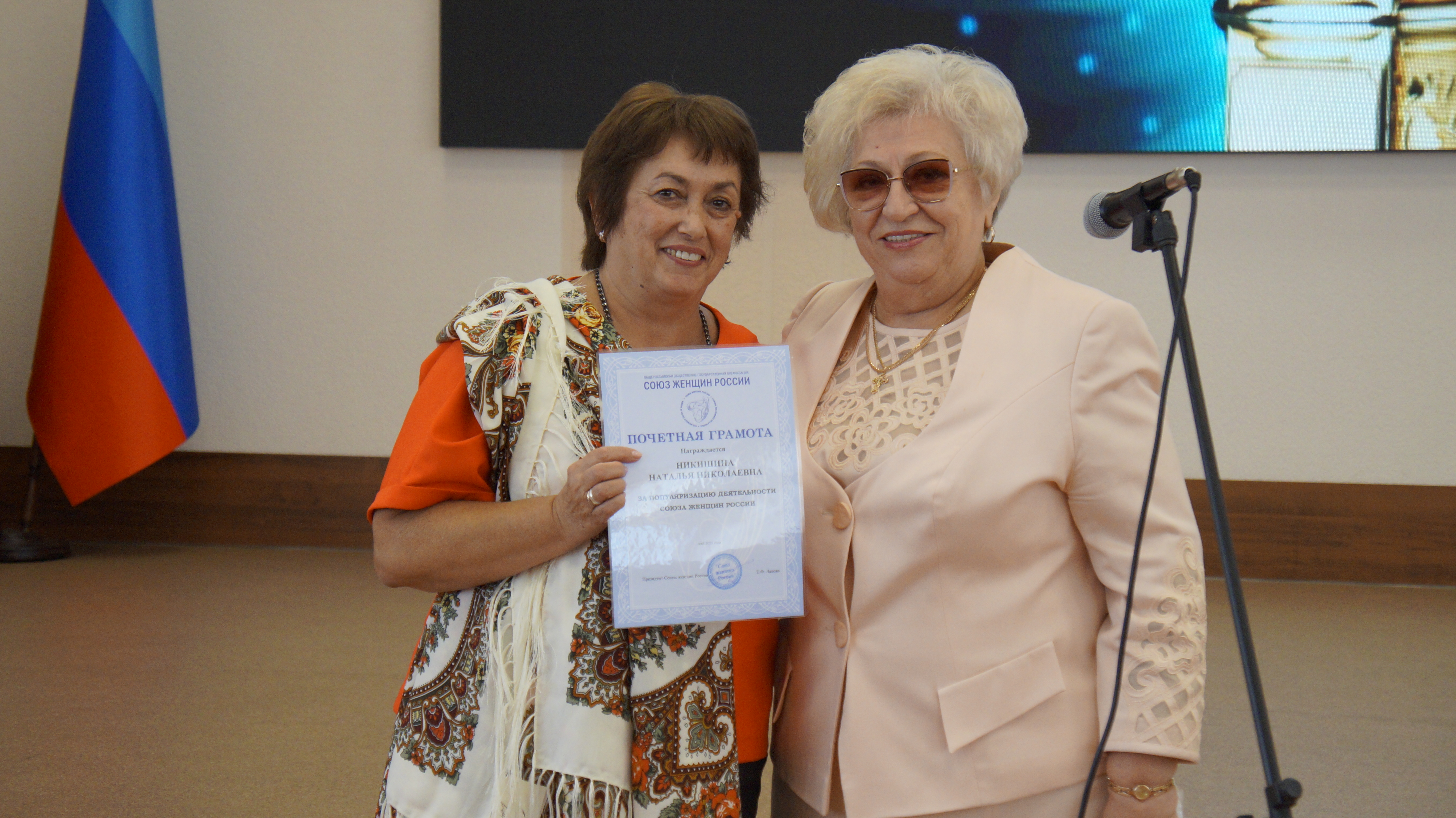 Председатель Луганского регионального отделения Союза женщин России Валентина Кияшко вручила Почетные грамоты и атрибуты СЖР подругам по женскому движению из женсоветов образовательных организаций, которые активно участвуют в реализации акций и проектов Союза женщин России, популяризируют его деятельность, уделяют большое внимание патриотическому воспитанию детей и оказывают существенную помощь участникам СВО.