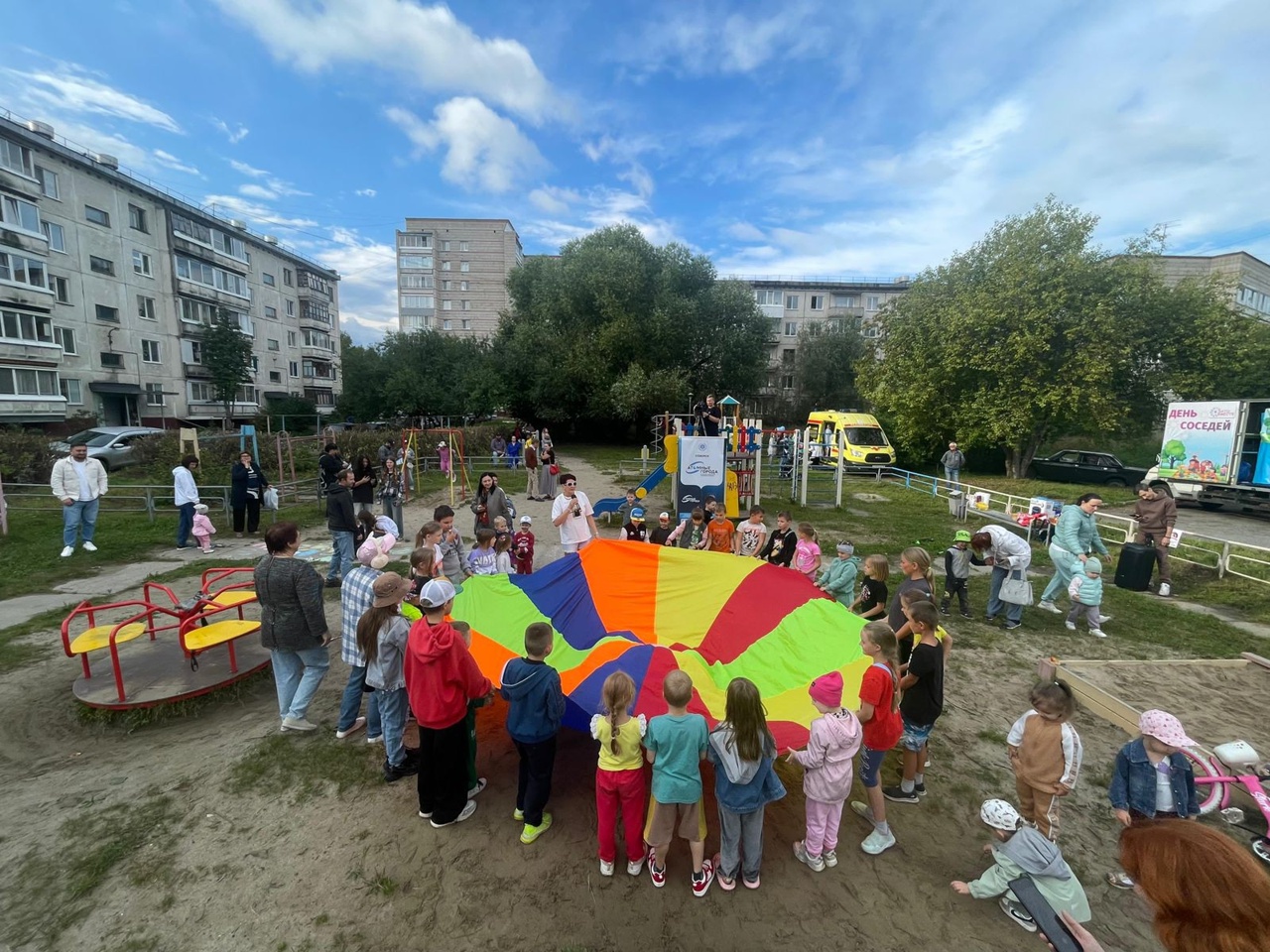 "Семьи с детьми с радостью посетили детскую игровую зону с различными локациями: аквагримом, рисованием мелками, мастер-классами. Мы пели песни, танцевали, обнимались, дарили дарить друг другу добрые улыбки, знакомились и общались. Незабываемые эмоции у детей остались от аниматоров в ростовых куклах на шоу мыльных пузырей. Благодарим администрацию Северска, депутатский корпус, общественные организации, жителей микрорайона за душевный праздник. Мы смогли ближе познакомиться друг с другом, семьи стали ближе общаться, а дети играть вместе. Совместный досуг помогает сплотить разных или незнакомых друг с другом людей- соседей. Мы одна семья- такие отзывы оставляли участники праздника".