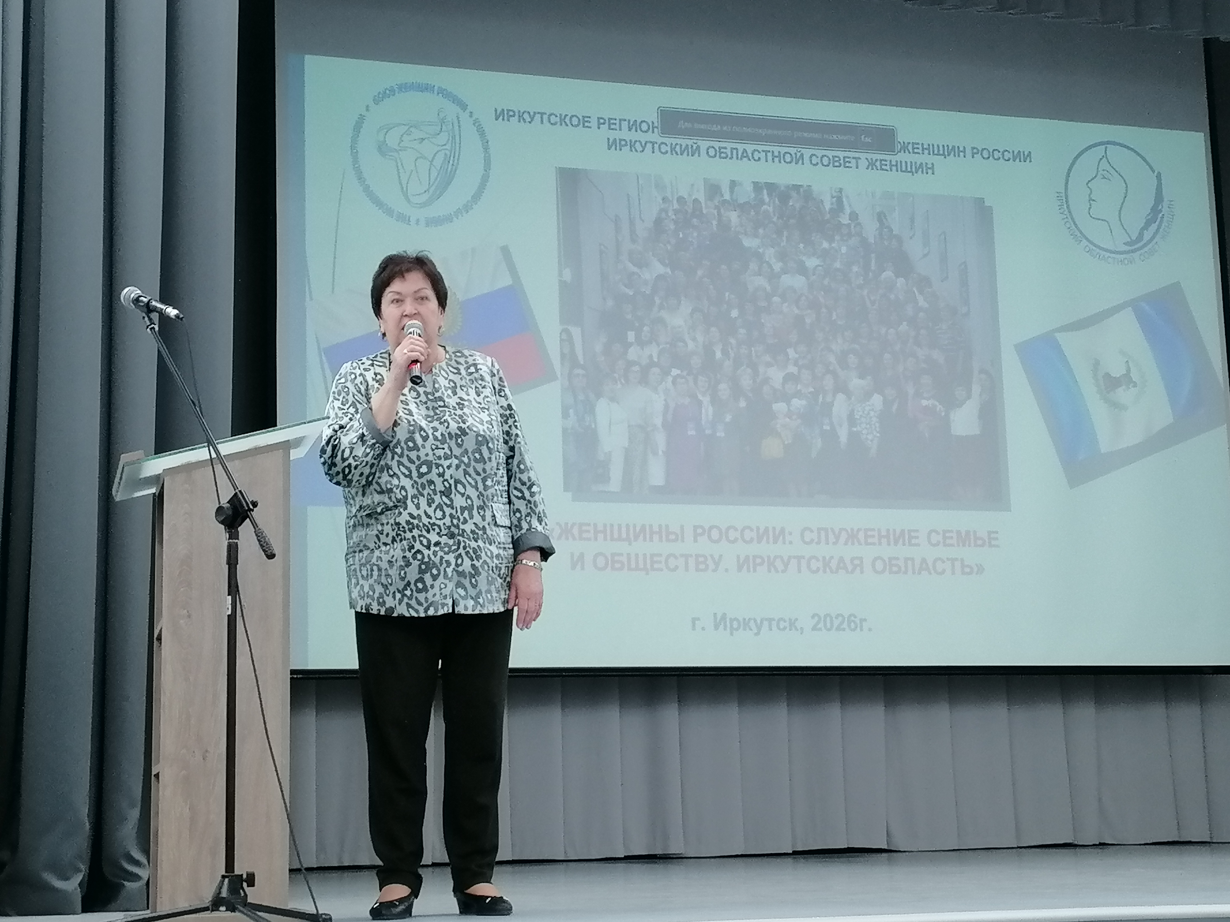 Галина Терентьева пожелала участницам Форума плодотворной работы и отметила особенность 2026 года, ознаменованного значимыми юбилейными датами: 85-летием Антифашистского комитета советских женщин и 50-летием Иркутского областного совета женщин, дополнив свое выступление показом фильма о Всероссийской общественно-государственной организации «Союз женщин России».