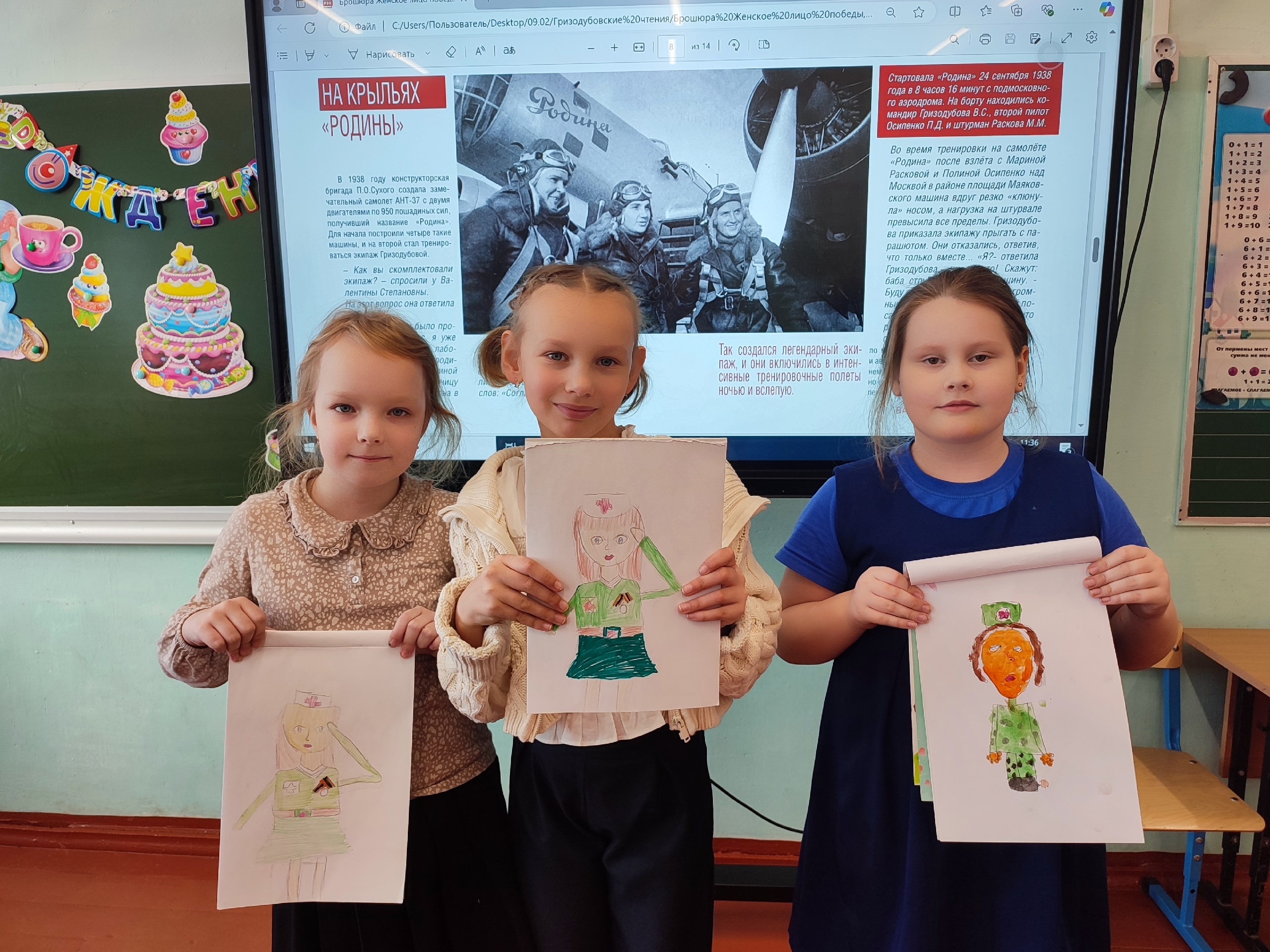 Благодарим активистку женсовета Пудожского района Елену Алексееву за столь увлекательный урок, который завершился выставкой детских рисунков. Юные авторы изобразили женщин-участниц Великой Отечественной войны.