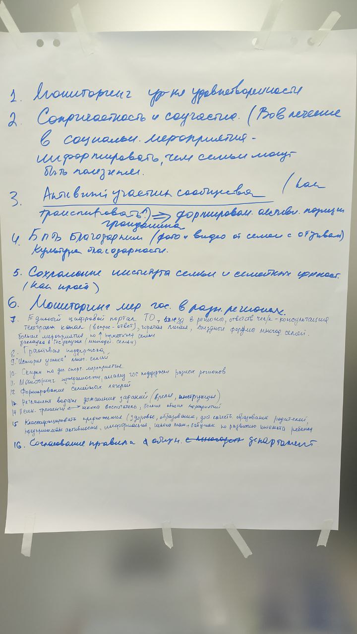 В течение трёх часов участницы формулировали проблемы, которые волнуют многодетные семьи, и определяли возможные варианты их решения. В результате совместной работы определили основные направления: образование и воспитание детей; образование и получение новых компетенций родителей; семейный бизнес; меры поддержки от государства; здоровье родителей; лечение и отдых всех членов семьи.