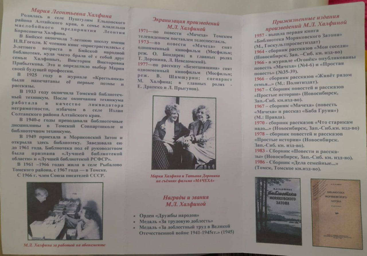 Для справки: Мария Халфина родилась в 1908 году на Алтае, в селе Пушталим. Получив образование, преподавала библиотечное дело в Томской краевой совпартшколе, долгие годы заведовала библиотекой в Моряковке, которая сейчас носит её имя. В 1964 году издан первый сборник рассказов писательницы «Мои соседи», а в 1966 году она была принята в Союз писателей СССР.