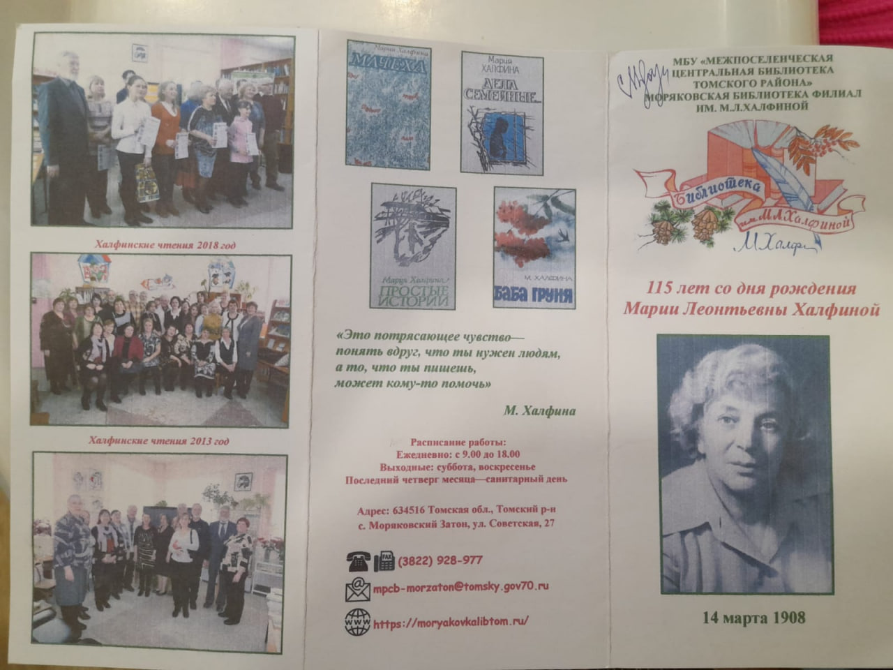 В Моряковской библиотеке прошла ознакомительная экскурсия "Именная библиотека - хранитель культурно-исторической памяти". Сотрудники библиотеки рассказали гостям о жизни и литературном творчестве писательницы и основательницы Моряковской библиотеки Марии Леонтьевны Халфиной. Участникам мероприятия были представлены фрагменты кинохроники: "О внедрении открытого доступа к фондам" и "Встреча М.Л. Халфиной с читателями". Они услышали песню из к/фильма "Мачеха" - "Трудное счастье" и любимую русскую народную песню М.Л. Халфиной "Сронила колечко" в исполнении Ольги Воронец.