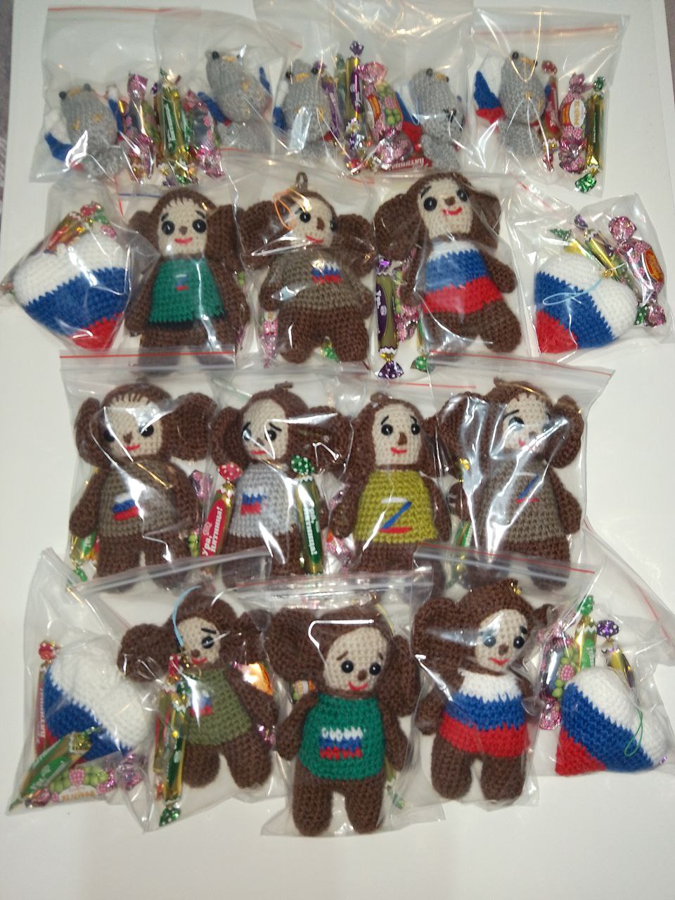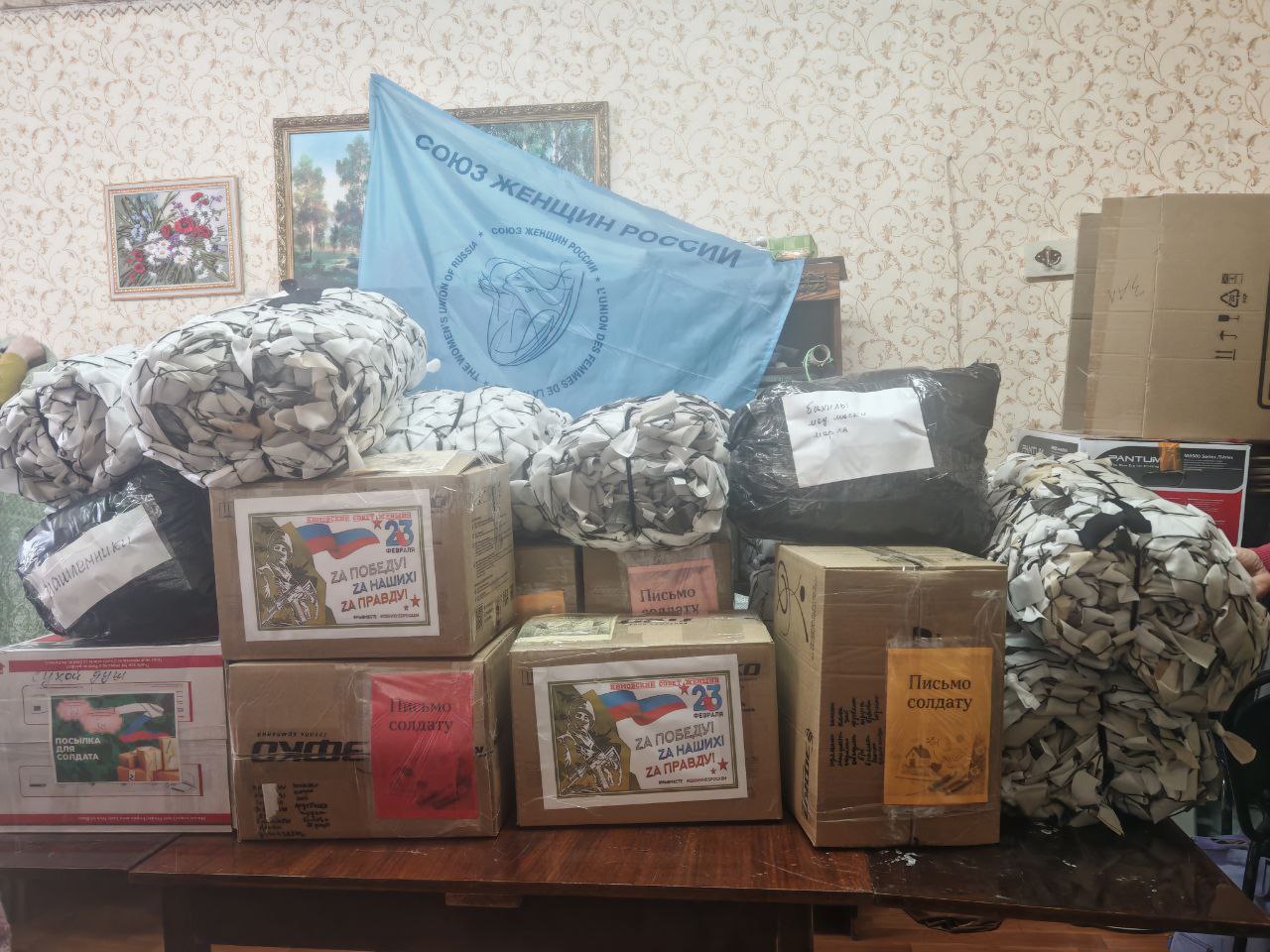 По традиции для отправки «за ленточку» были связаны маскировочные сети, браслеты выживания, шерстяные носки, изготовлены блиндажные свечи и сухие души, закуплены медикаменты, газовые баллоны, шапки, валенки и нательное белье, чай, кофе, сигареты, кондитерские изделия, крупы.