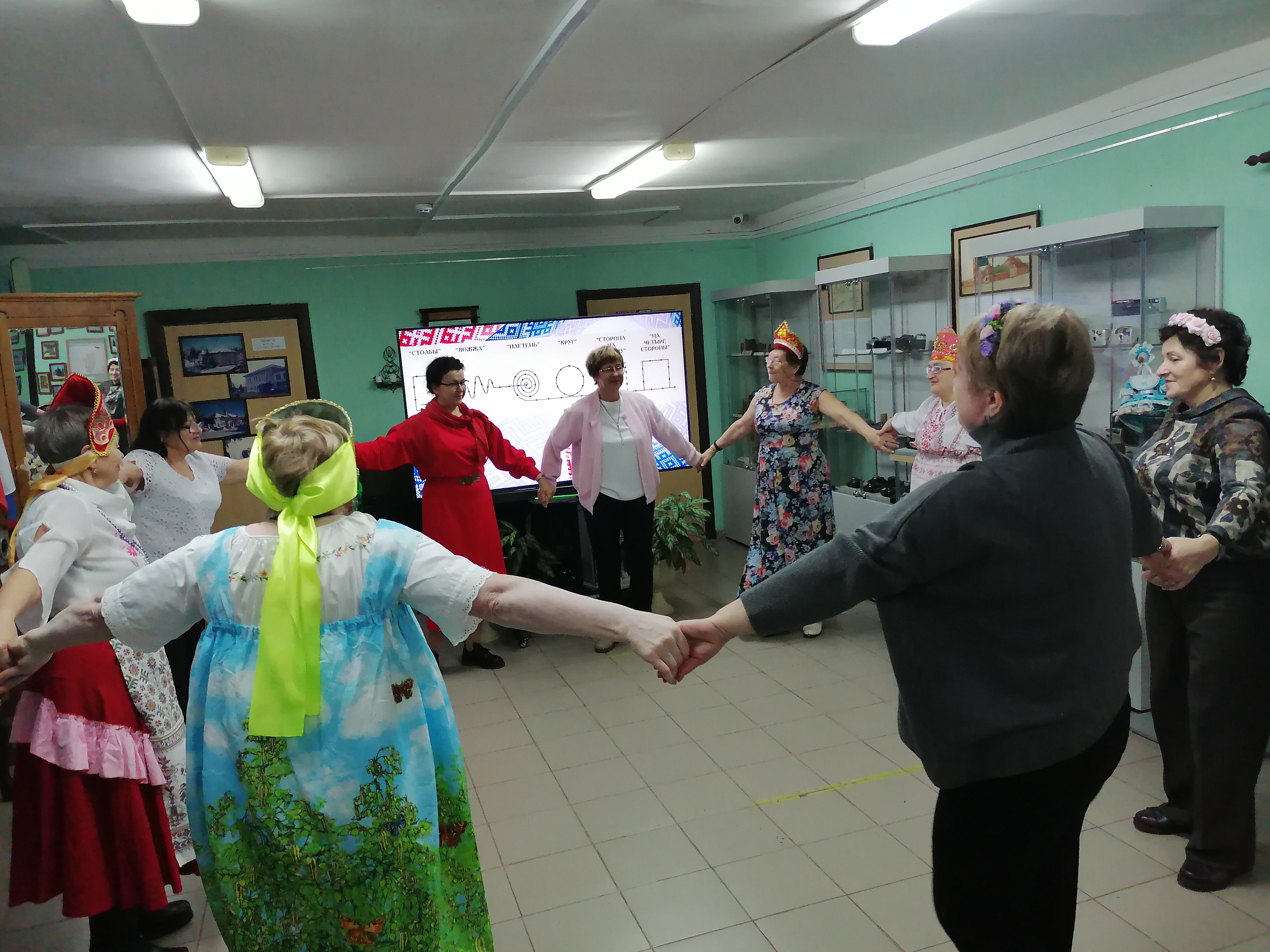 Союзницы районного женсовета давно сотрудничают с музеем, являются участниками и соорганизаторами многих проводимых здесь мероприятий. Вот и в этот раз наши подруги были не просто посетителями. Зная заранее тему встречи, женщины надели народные костюмы и аксессуары, с удовольствием включились в изучение фигур танца.