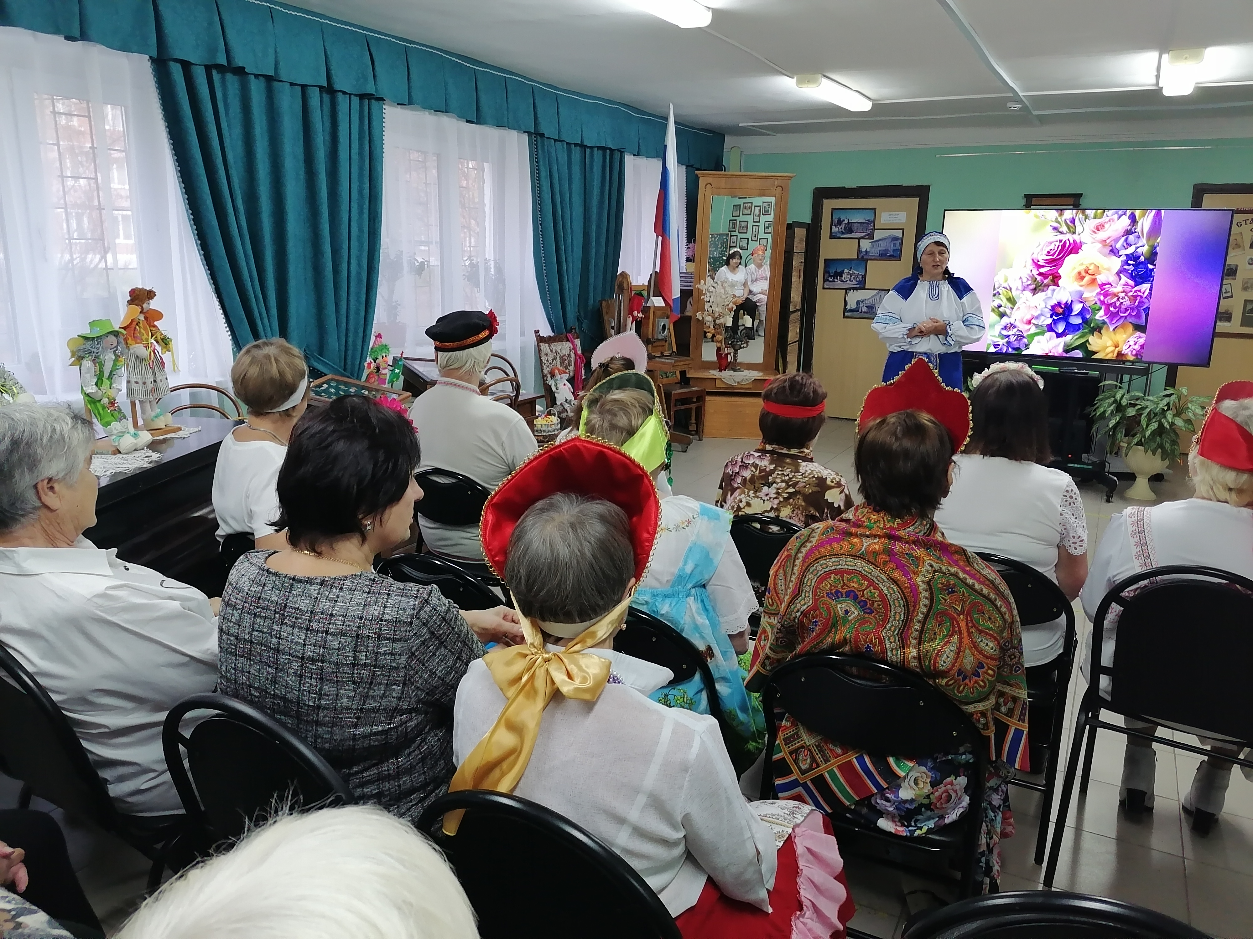 Активистка женсовета, экскурсовод Елена Кокорева рассказала об истории русского хоровода, традициях и правилах этого обязательного в старину и распространенного танца, отметив, что в хороводе народное пение и движение неотделимы друг от друга.