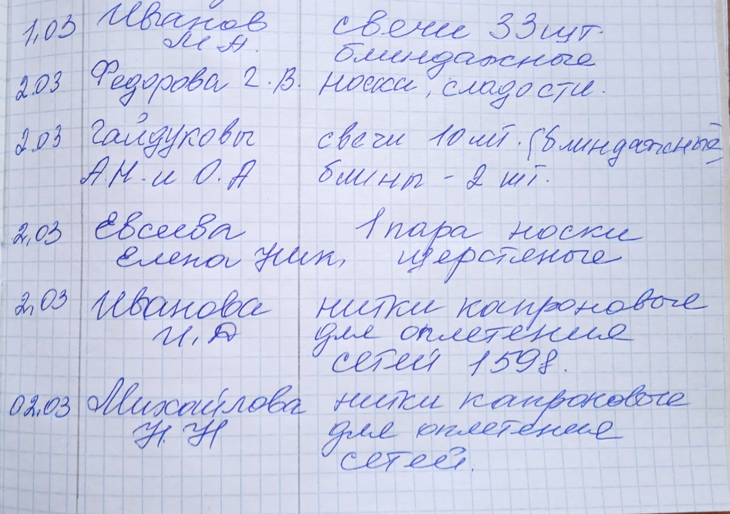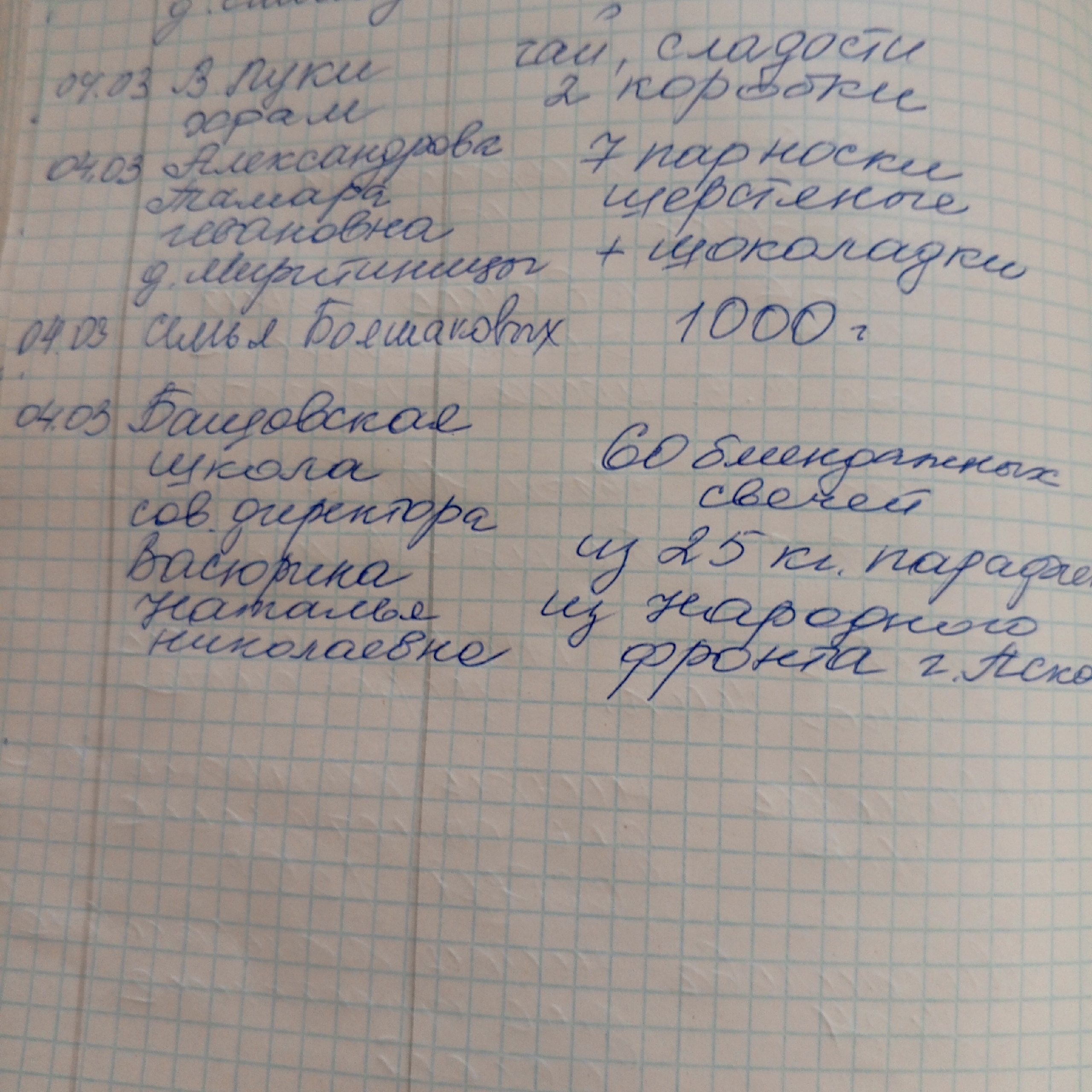 Отчет ведется по каждому поступлению средств и оказанной помощи, каждый взнос записывается в специальную тетрадь. Вот лишь несколько записей работы в тылу: