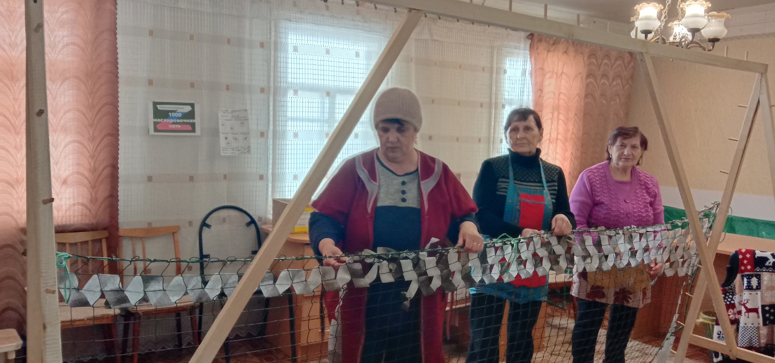 - Команда "Миритиницы" за прошедшую неделю сплела три маскировочных сети. Благодарим Любовь Егоровну Рожкову, Любовь Николаевну Евстигнееву, Надежду Алушкову, Любовь Федоровну Пушкину. За доставку сетей благодарим Юрия Викторовича Волкова. Всем здоровья, чистого неба над головой! Всё для Победы!