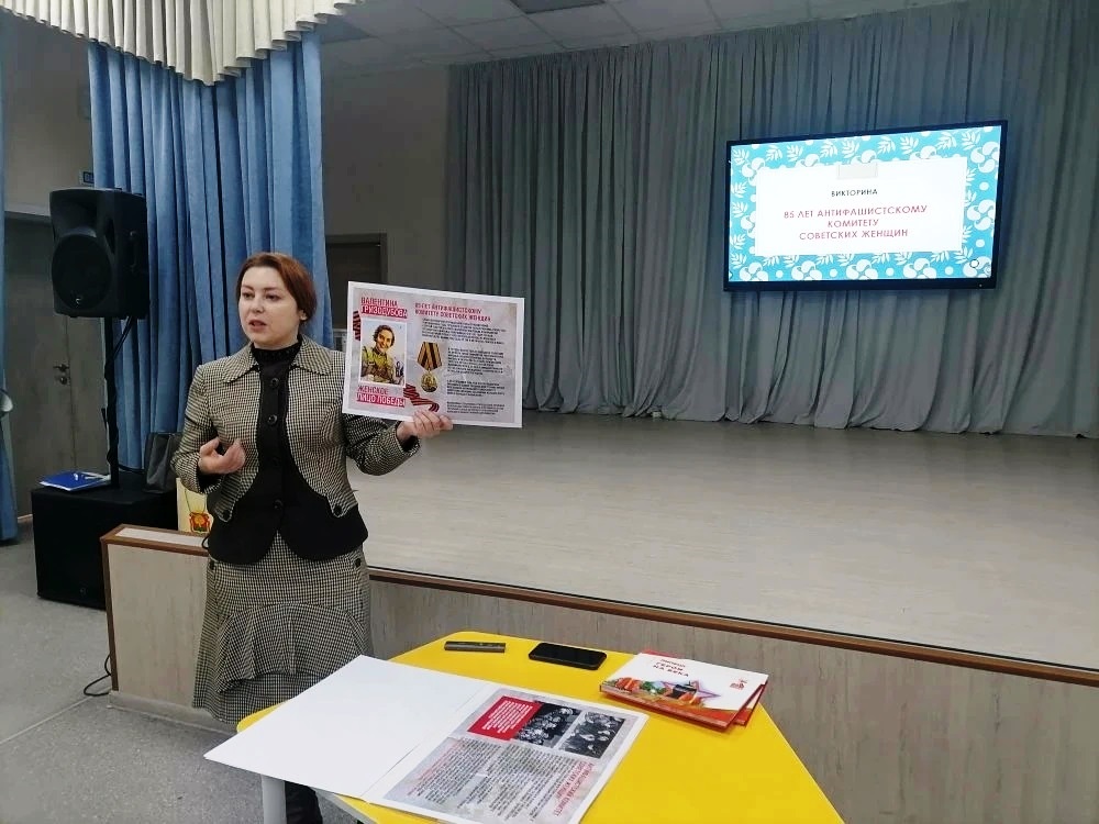 Вероника Александровна рассказала школьникам о Валентине Степановне Гризодубовой - легендарной летчице, первой женщине-Герое Советского Союза, основательнице и первом председателе Антифашистского комитета советских женщин.