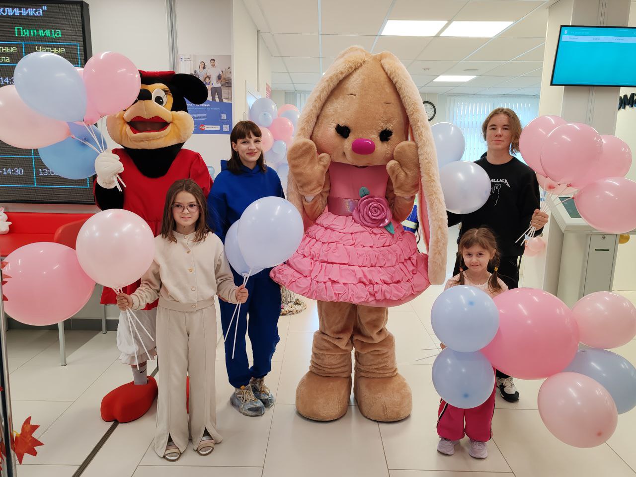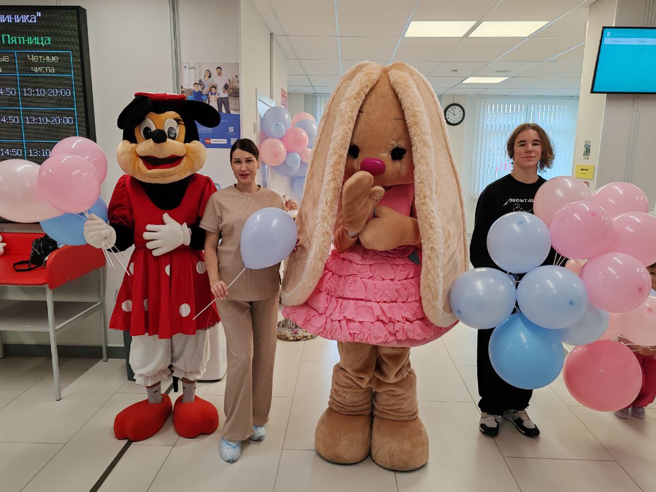 В холле женской консультации гостей встречали музыкой и ростовыми куклами, создавая теплую и уютную атмосферу.