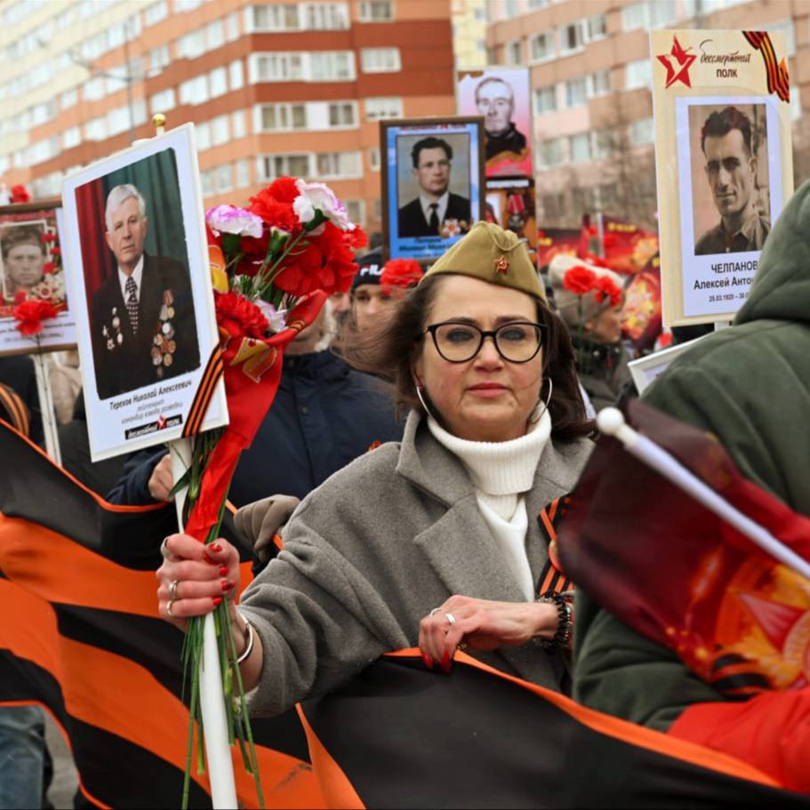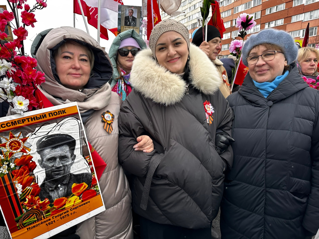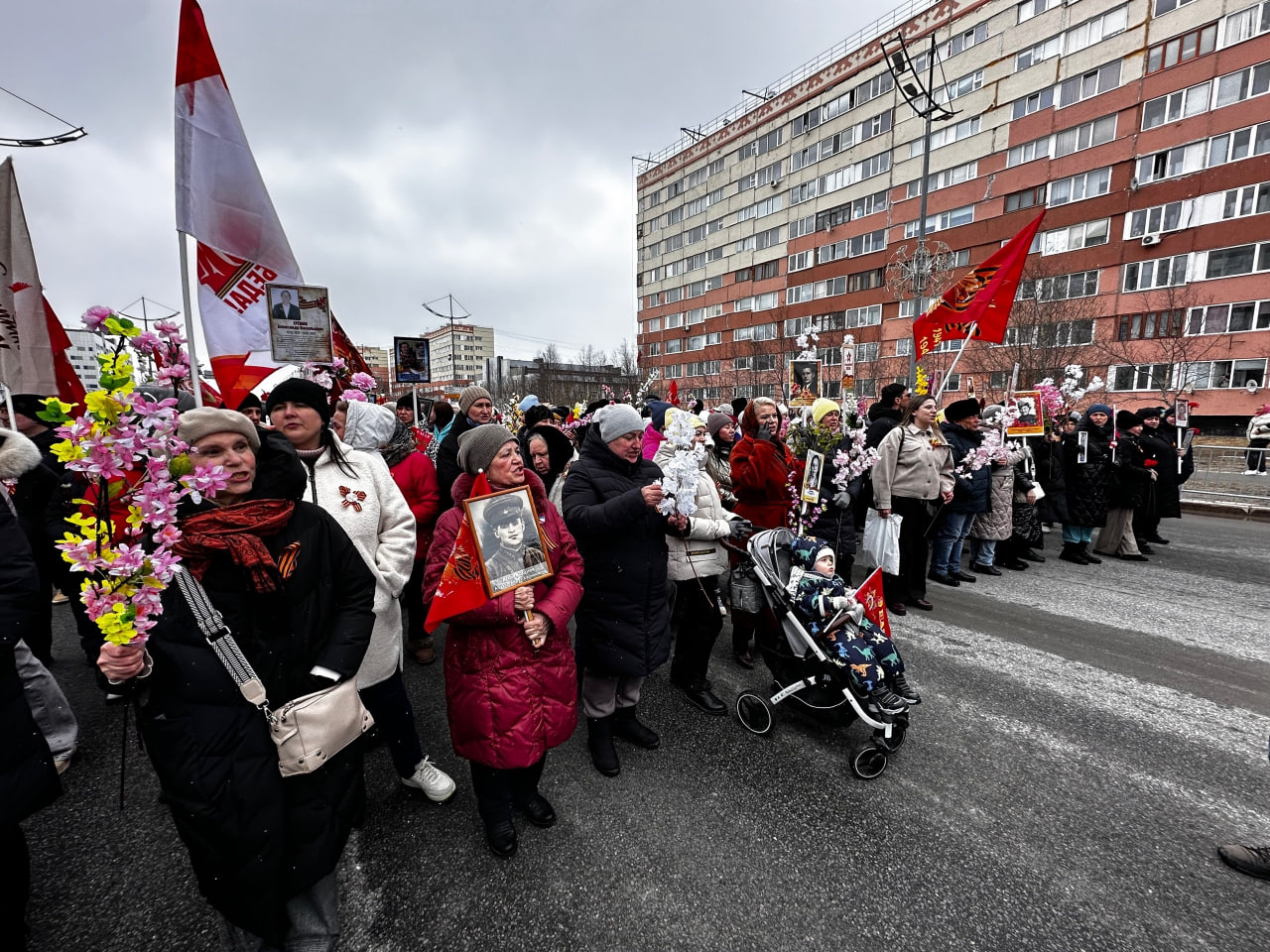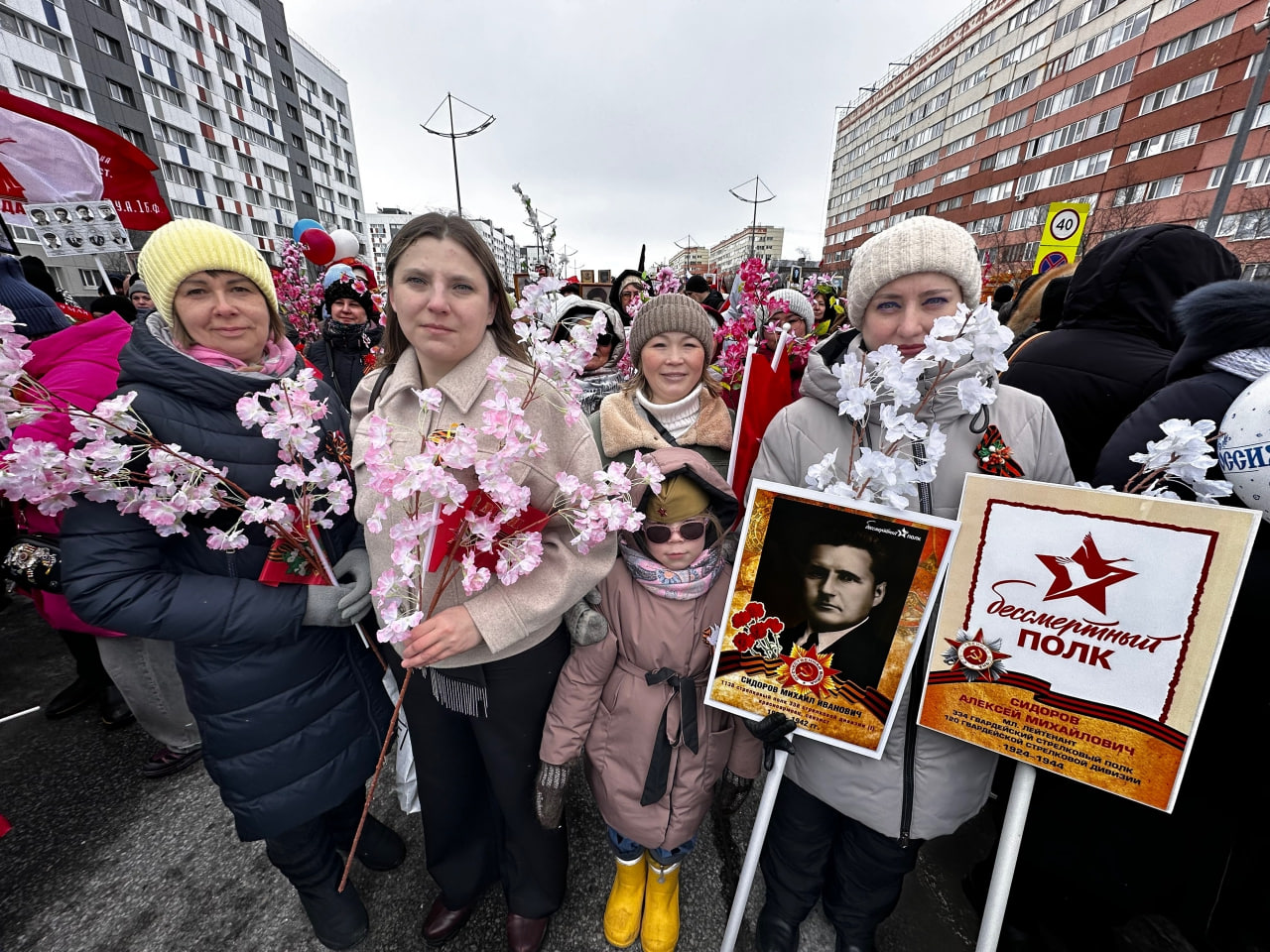 9 Мая участницы Новоуренгойского женсовета с российскими флагами, знаменами Победы и портретами своих дедов и прадедов - фронтовиков и тружеников тыла - прошли по Ленинградскому проспекту вместе с "людской рекой" Бессмертного полка.