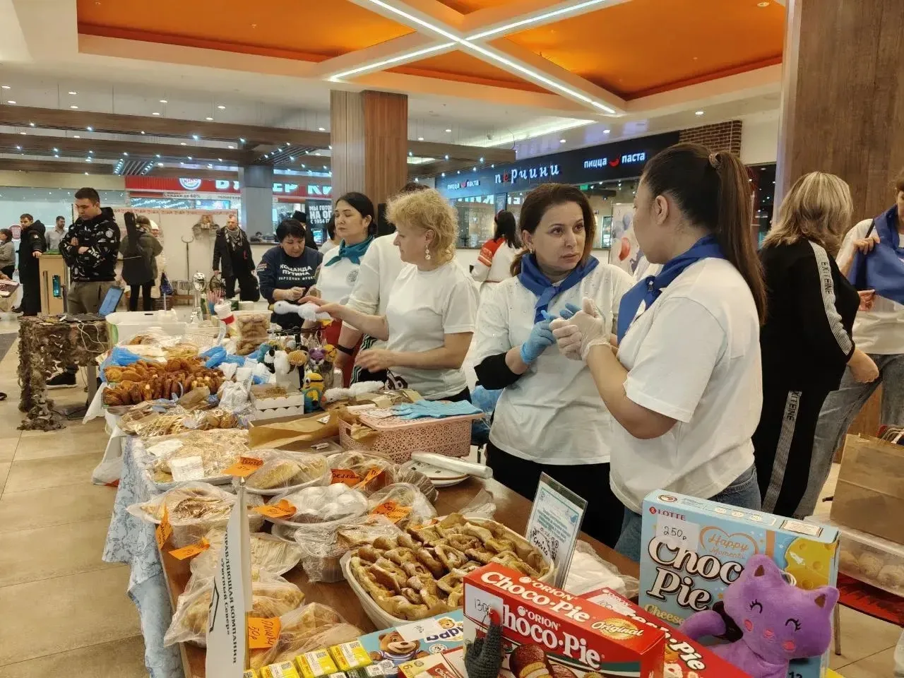 А умелые хозяюшки из женсовета приготовили кулинарную продукцию, которую продавали на благотворительной ярмарке.