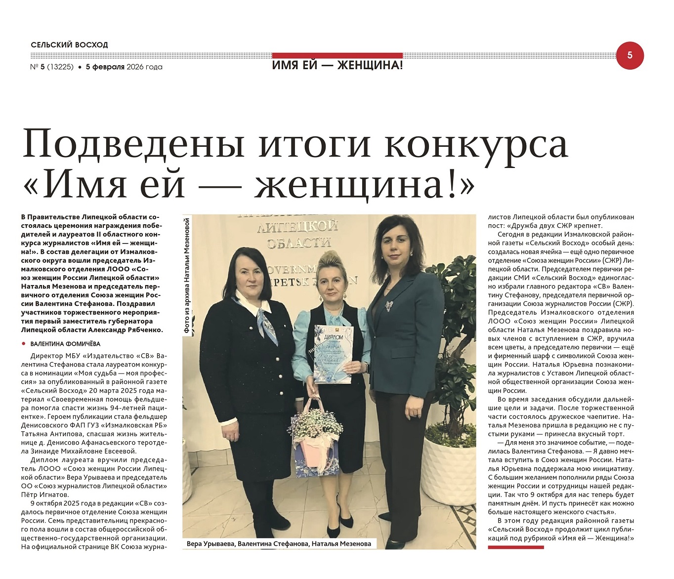 Диплом лауреата вручили председатели Союза женщин Липецкой области Вера Урываева и председатель Союза журналистов региона Пётр Игнатов. 9 октября 2025 года в редакции «СВ» создалось первичное отделение Измалковского совета женщин. Семь представительниц прекрасного пола вошли в состав организации.