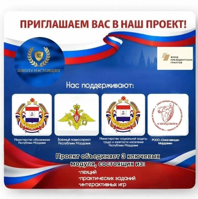 Масштабный проект «Школа настоящих» направлен на формирование у школьников активной жизненной позиции, готовности действовать в нестандартных ситуациях; знакомство с героическими страницами истории родного края и родной страны. Он включает просветительские лекции, практические занятия, спортивно-познавательные игры, выездные экскурсии, встречи с героями нашего времени. Важная цель работы – закрепить в системе ценностей юного гражданина страны понимание, что помогать - это норма, это путь настоящего человека.