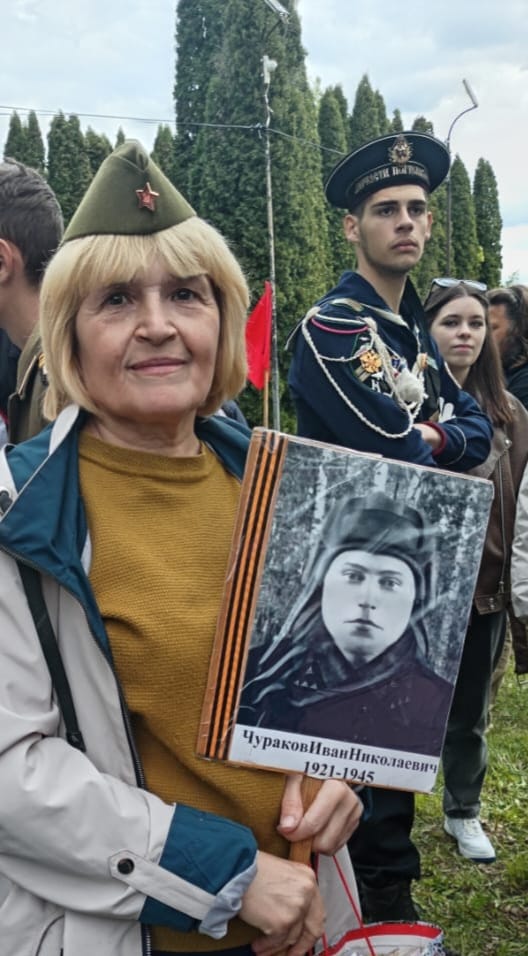 Остаётся добавить, с какой любовью и трепетом рассказала Марина Николаевна о своих героях далекой войны. На фотографии она держит портрет молодого механика – водителя СУ-85 Ивана Чуракова.