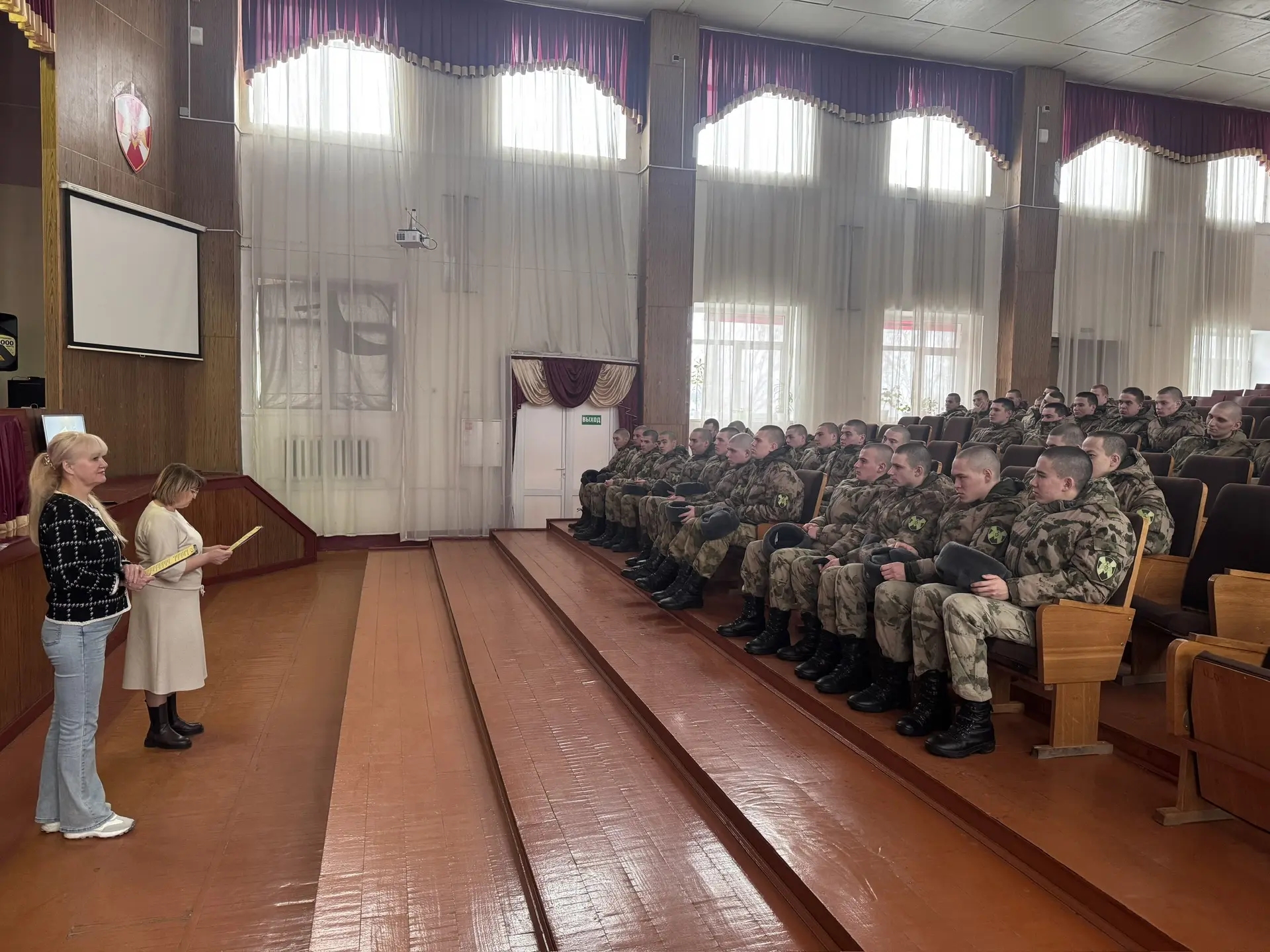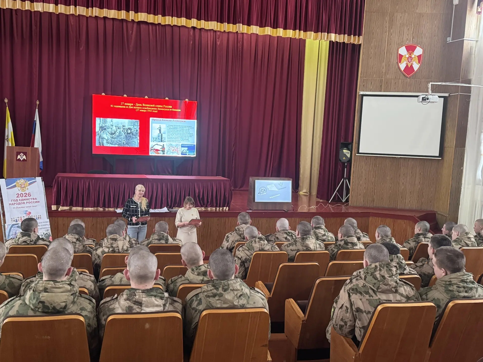 Заведующий библиотекой-филиалом-4 им. А. Губина, член женсовета посёлка Горячеводский Наталья Рядская и председатель поселкового женсовета Елена Кучмасева рассказали военнослужащим срочной службы о тех страшных 900 днях боли и страданий, мужества и самоотверженности людей и о том, как героический город, пройдя через нечеловеческие испытания, выстоял, а его жители и защитники дали отпор врагу и показали всему миру величайший пример героизма.