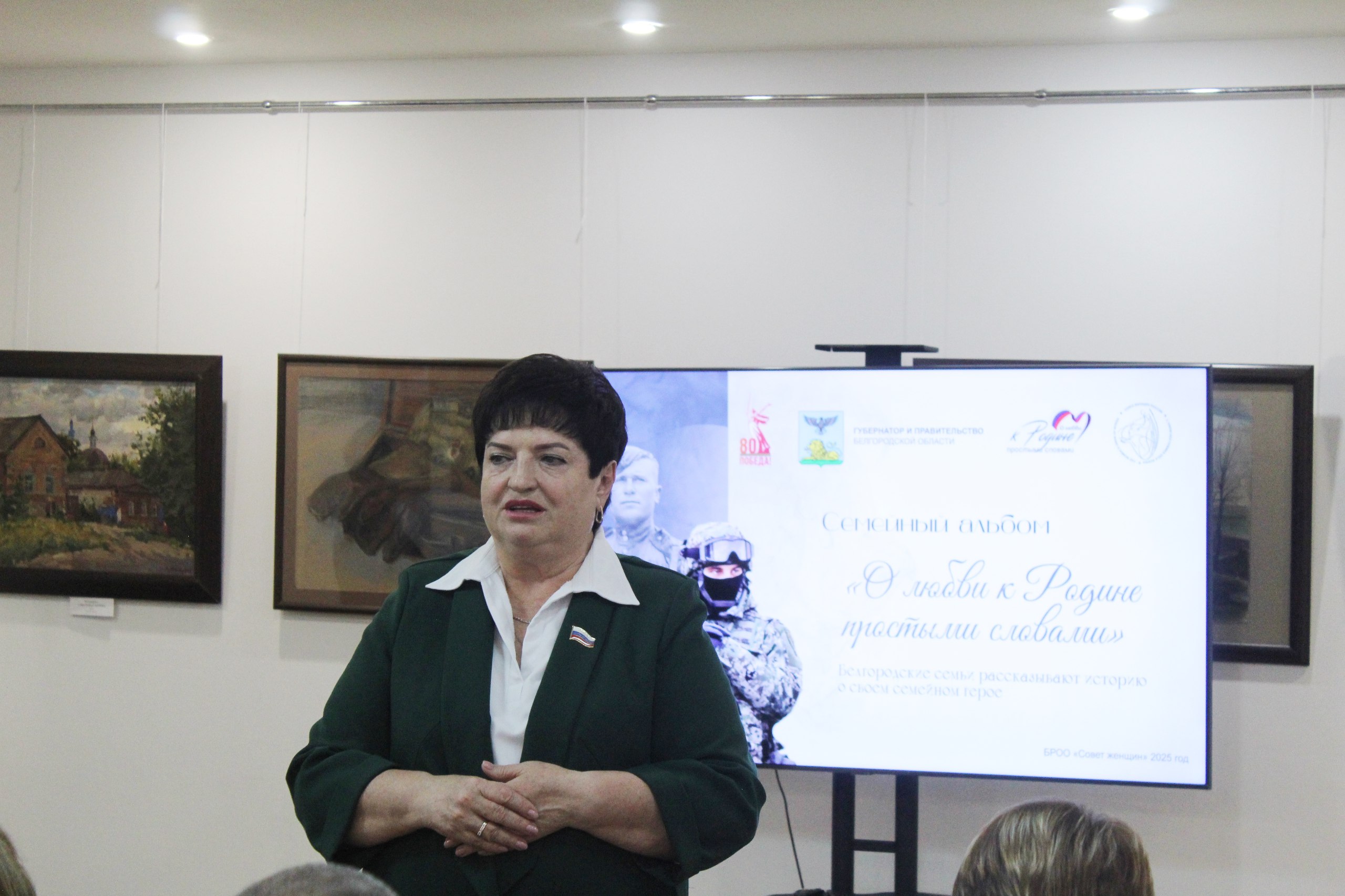Председатель РО СЖР Любовь Петровна Киреева вручила белгородским семьям альбомы, в которые вошли истории об их родственниках - героях былых времен и дня сегодняшнего: 70 имен героев, 70 судеб, которые прославили наш край, 70 признаний в любви...