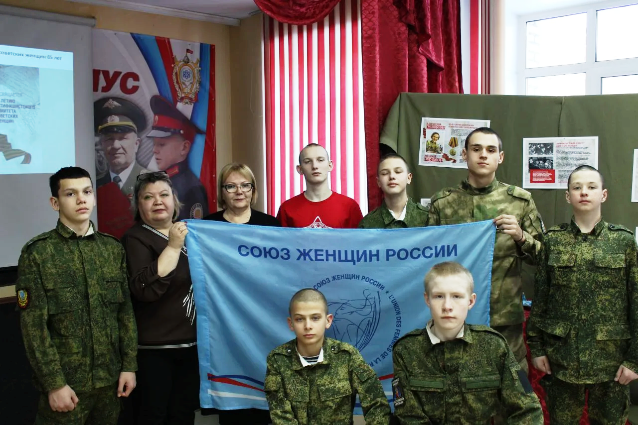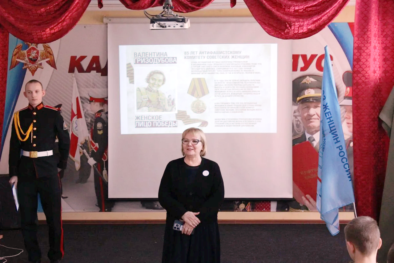 Председатель Томского регионального отделения СЖР Людмила Петушихина рассказала кадетам о Союзе женщин России - самой многочисленной женской организации страны - историческом, идейном и духовном преемнике Антифашистского комитета советских женщин. В своем выступлении Людмила Александровна сделала акцент на личности основателя и первого председателя АКСЖ Валентины Степановны Гризодубовой.