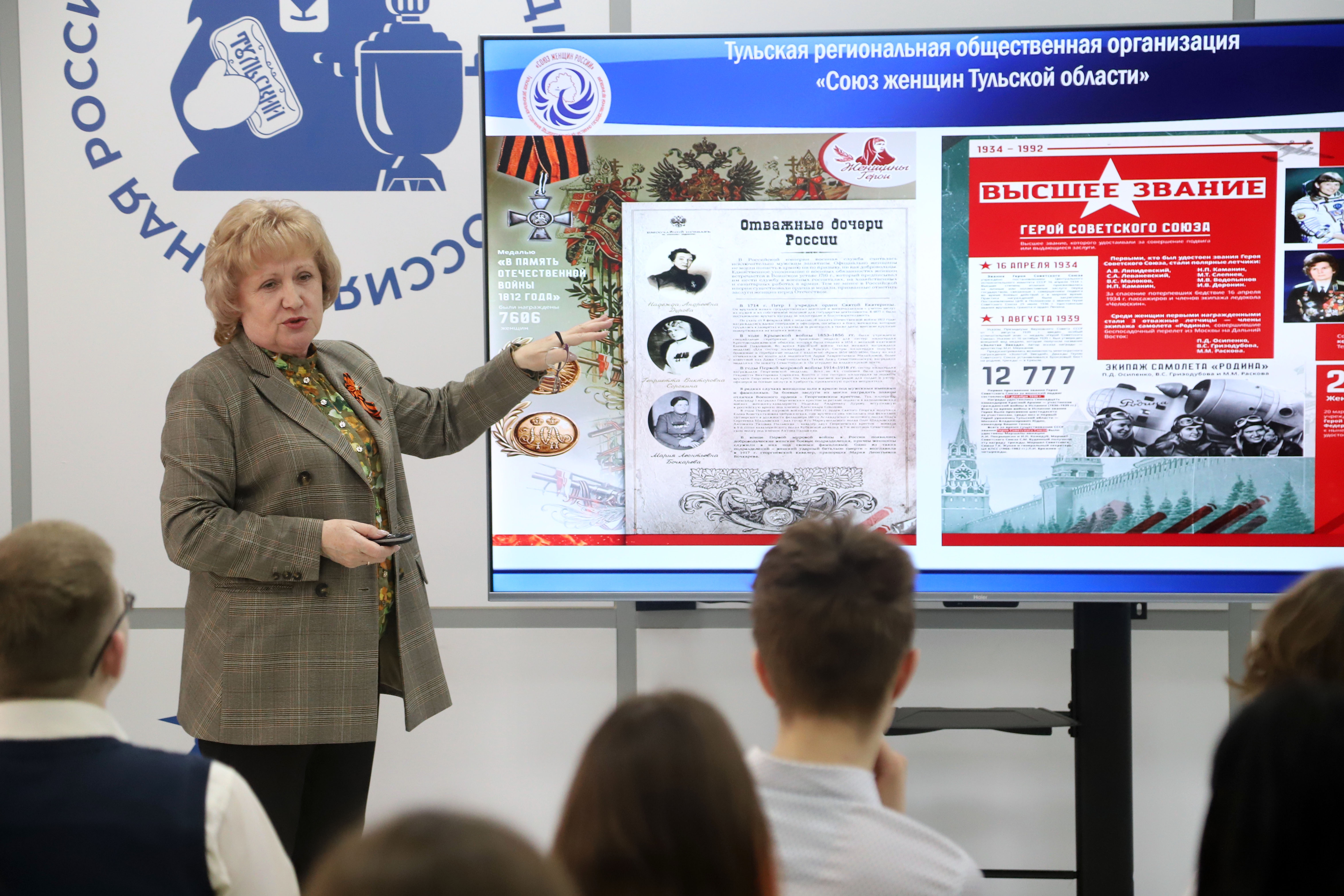 В рамках Всероссийской акции СЖР «Женское сердце Победы» 28 апреля, в День памяти Валентины Степановны Гризодубовой, представители Тульского регионального отделения Союза женщин России организовали и провели патриотическую встречу со школьниками.
