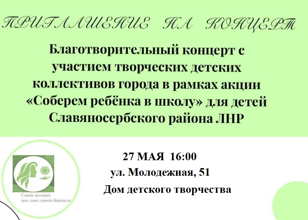 Совет женщин при главе города Барнаула в канун Международного дня защиты детей организовал четвертый благотворительный концерт в рамках акции «Соберем ребенка в школу» в помощь детям Славяносербского района Луганской Народной Республики.