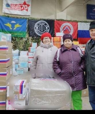 Женщины тщательно упаковывают в коробки принесённую гумпомощь, делают описи содержимого посылок. Отправка груза на передовую проходит через волонтёрский склад Томского отделения "Опоры России", расположенный в селе Зоркальцево. Отвозит и передаёт посылки на склад Виктор Хлебников - председатель организации "Земляки северных территорий". Сопровождает гуманитарные грузы до мест доставки Нина Губина - волонтёр СВО, член Комитета семей воинов Отечества Томской области, депутат местной Думы.