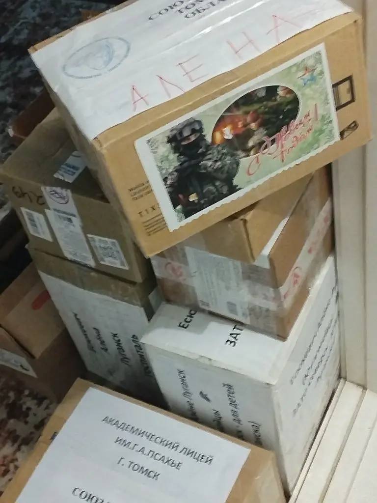 Людмила Петушихина, председатель региональное отделение Союза женщин России, рассказала, что в предновогоднюю гуманитарную отправку вошли посылки с медикаментами, индивидуальными наборами, а также письма, обереги и небольшие сувениры, подготовленные учащимися Академлицея города Томска (организатор - Лариса Аввакумова) и юнармейцами ЗАТО Северск (организатор - Юлия Ткачёва).