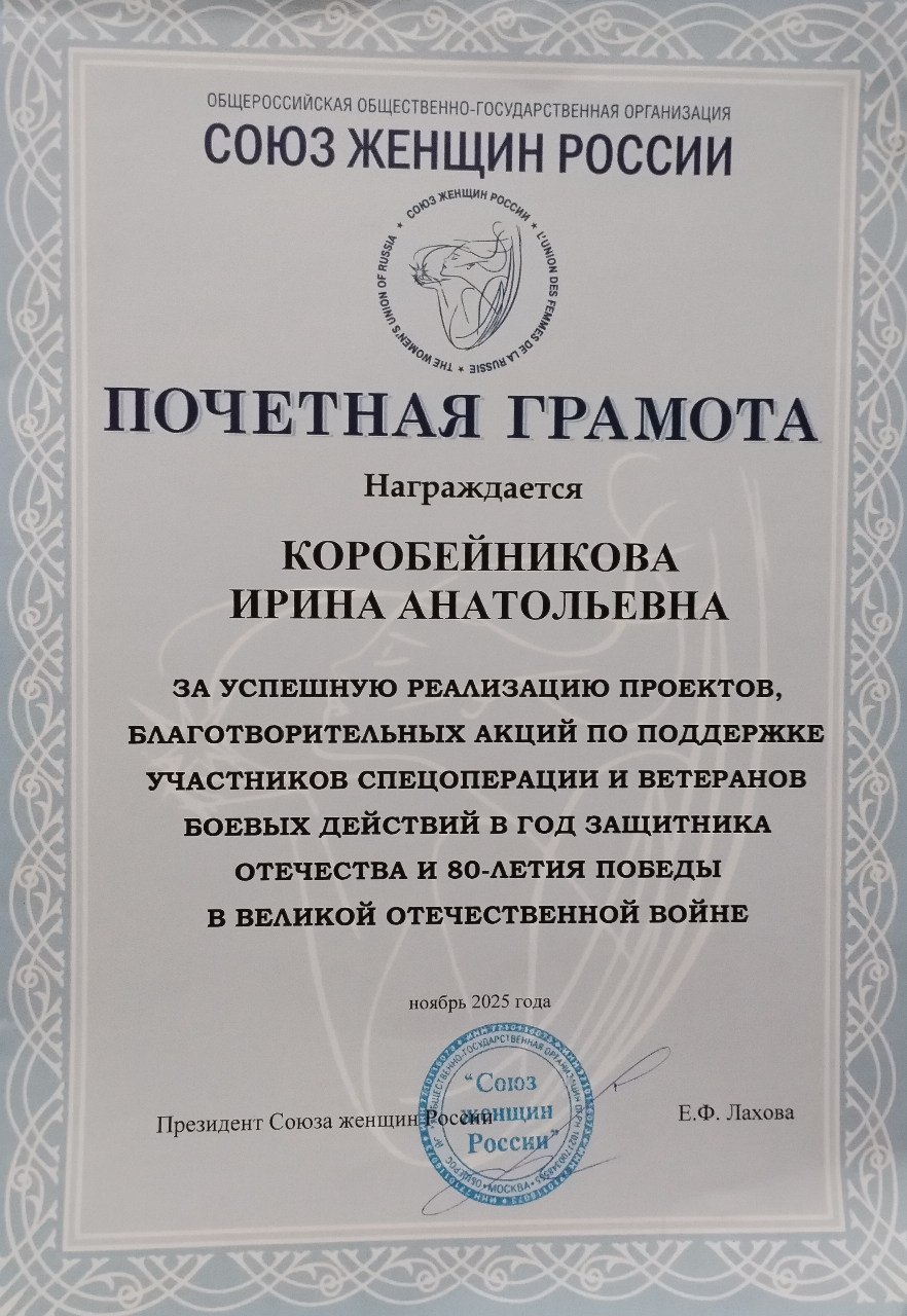 По итогам работы по оказанию помощи участникам спецоперации в 2025 году 15 самых активных женщин региона были награждены почётными грамотами Союза женщин России. Среди них - Ирина Коробейникова, президент Союза коренных малочисленных народов Томской области, член Томского регионального отделение СЖР.