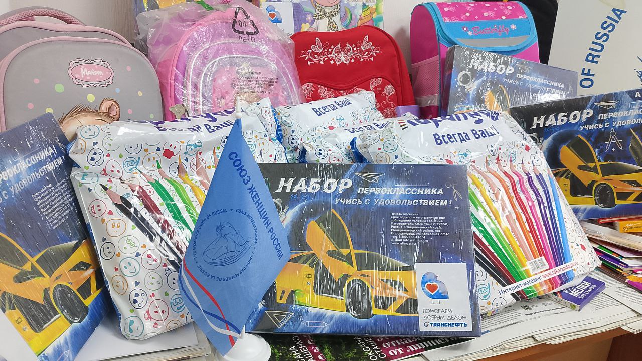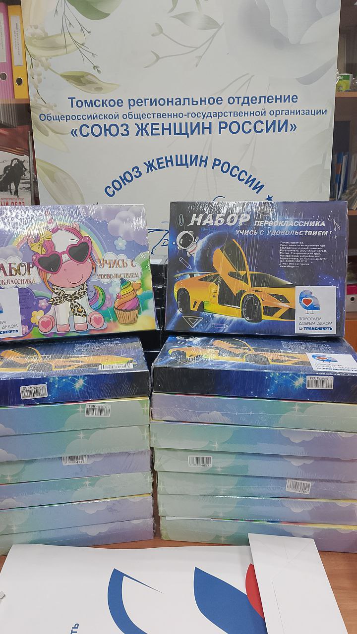 Ещё 36 наборов первоклассника поступило от волонтёрского отряда одного из предприятий объединения "Транснефть" - партнёра Союза женщин Томской области.