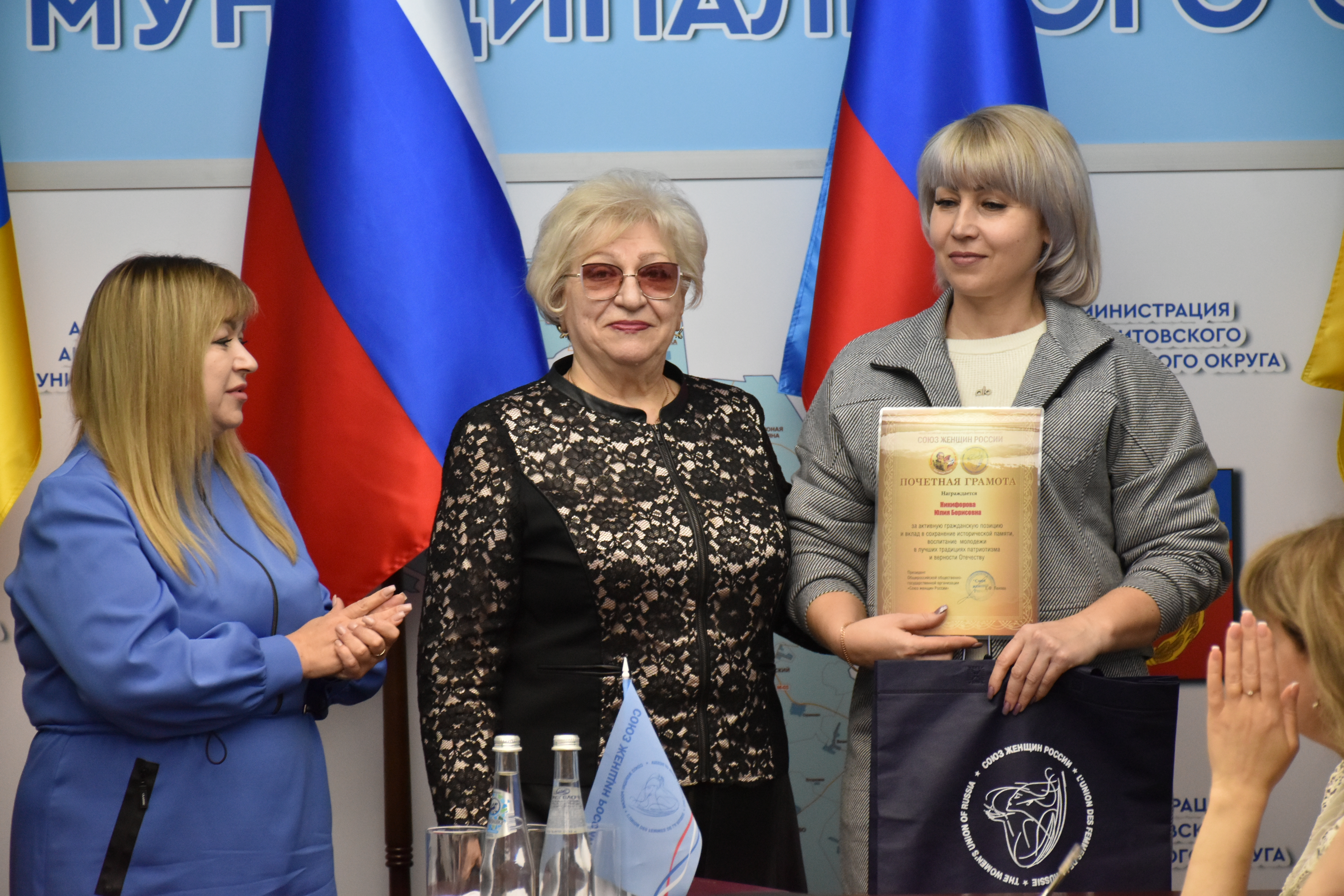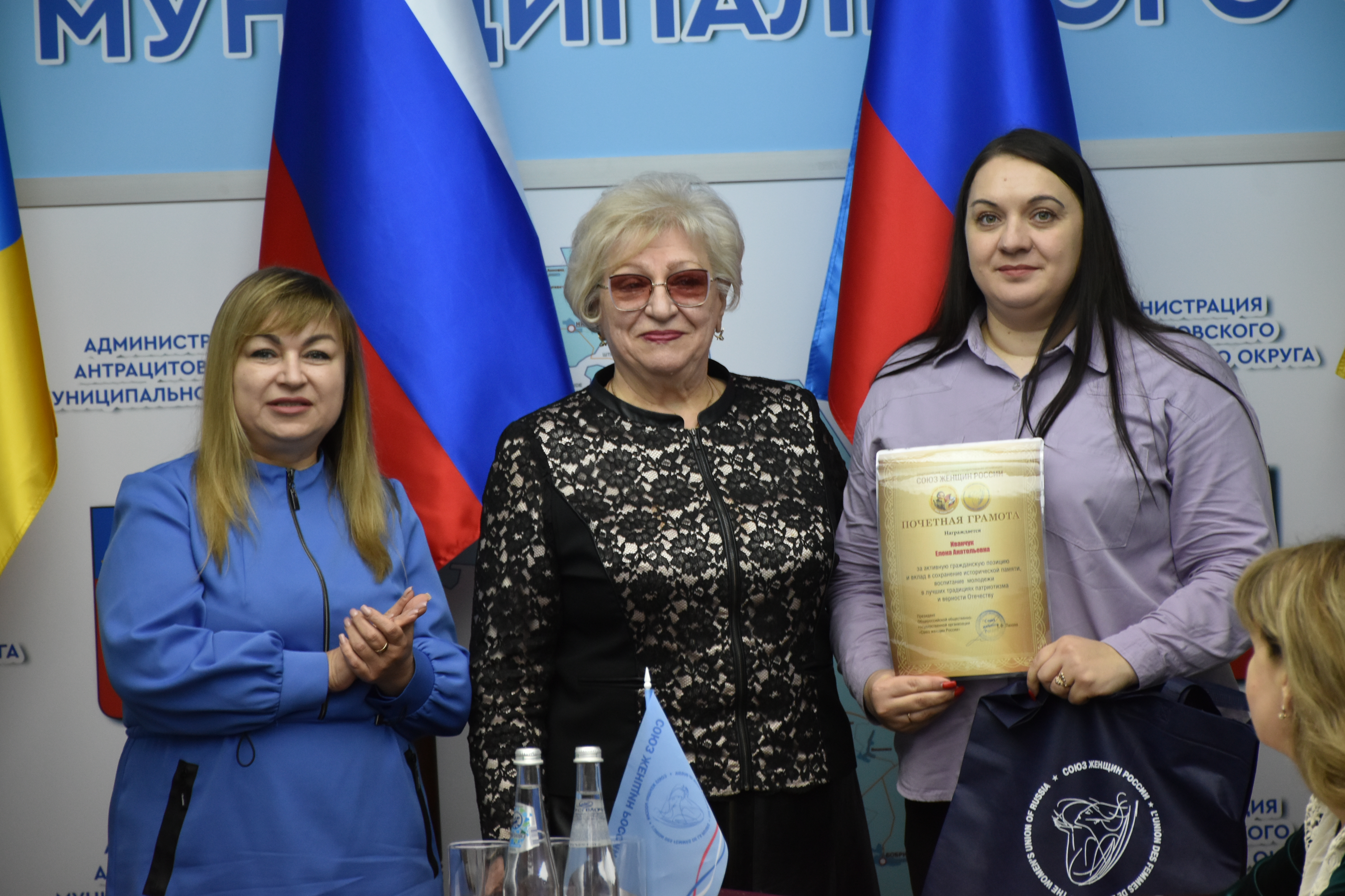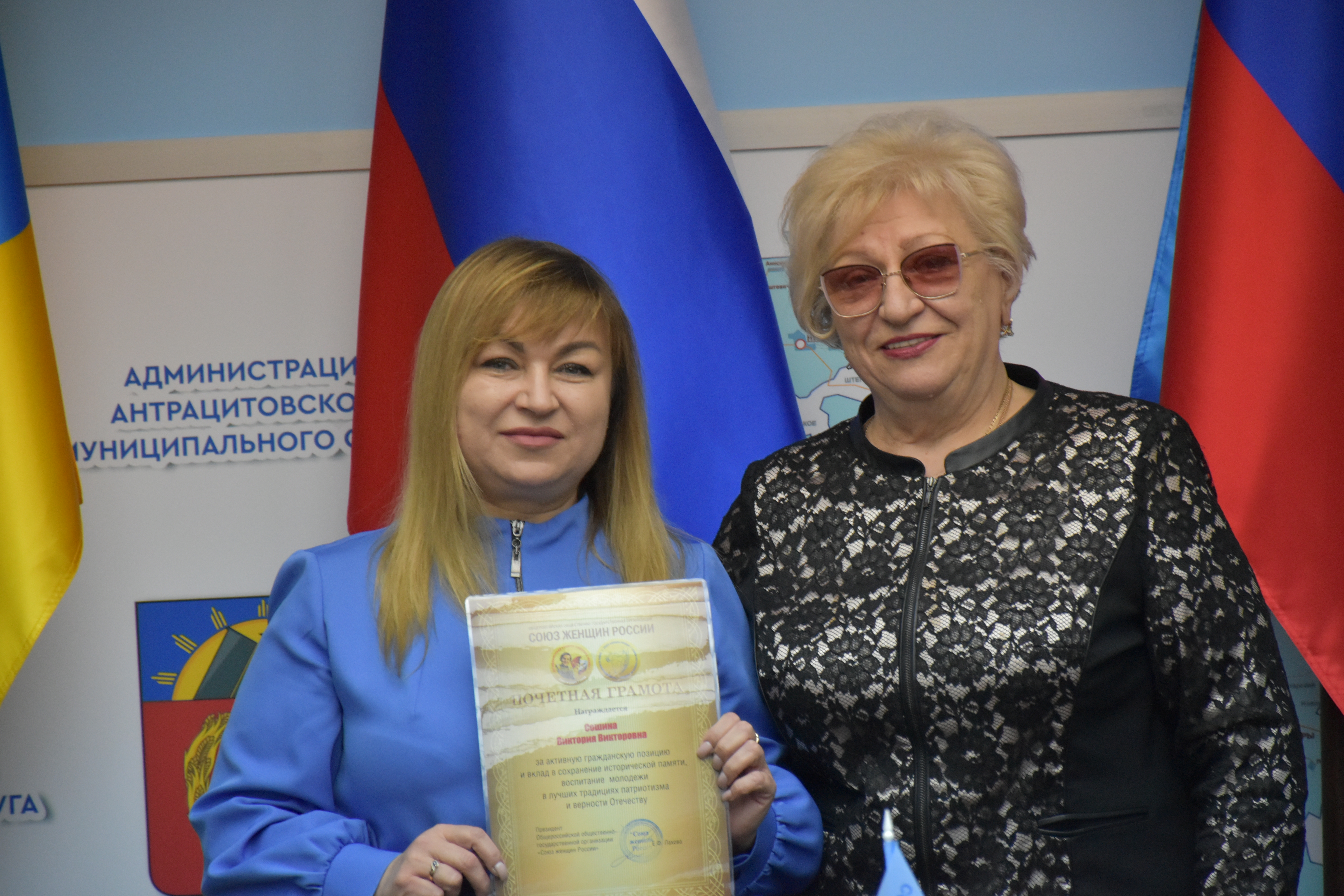 Активисткам Совета женщин Антрацитовского муниципального округа вручили юбилейные почётные грамоты и атрибутику Союза женщин России.