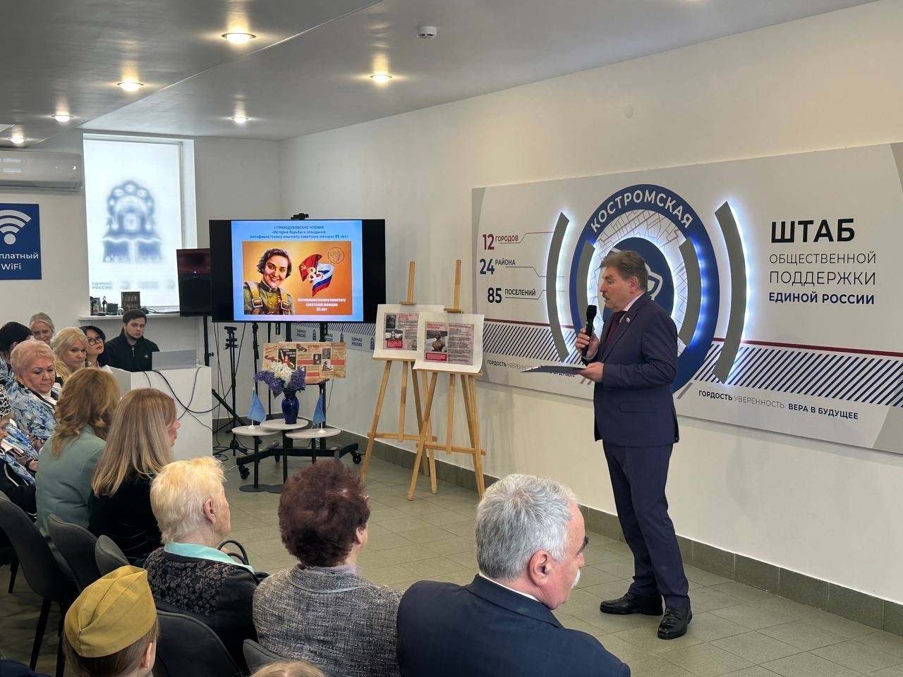 На площадке Штаба общественной поддержки собрались люди самых разных профессий и поколений, чтобы отметить 85-летие создания Антифашистского комитета советских женщин.