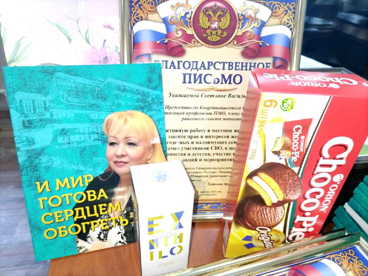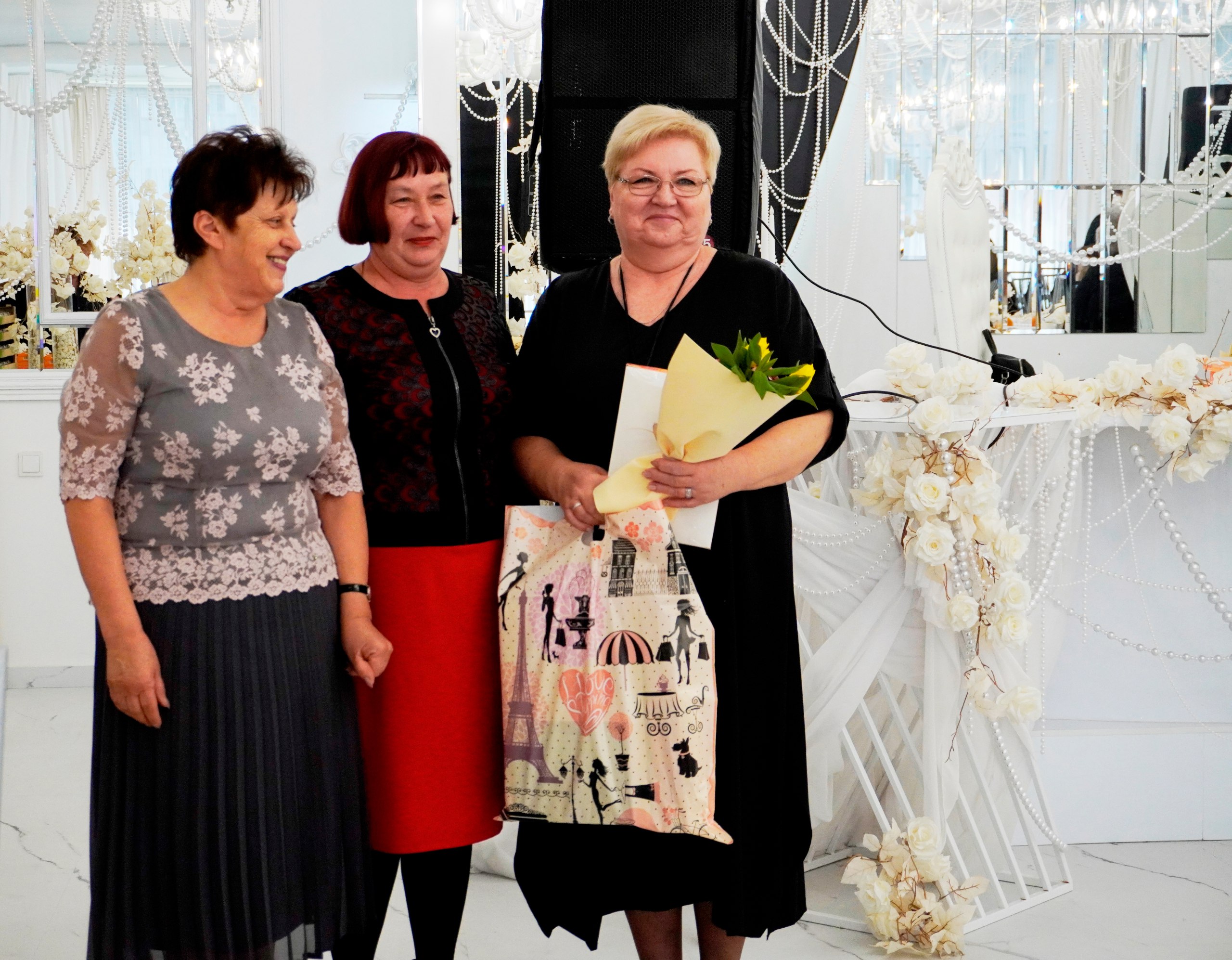 Затем состоялось вручение благодарственных писем от Союза женщин края, цветов и памятных подаркам виновницам торжества.