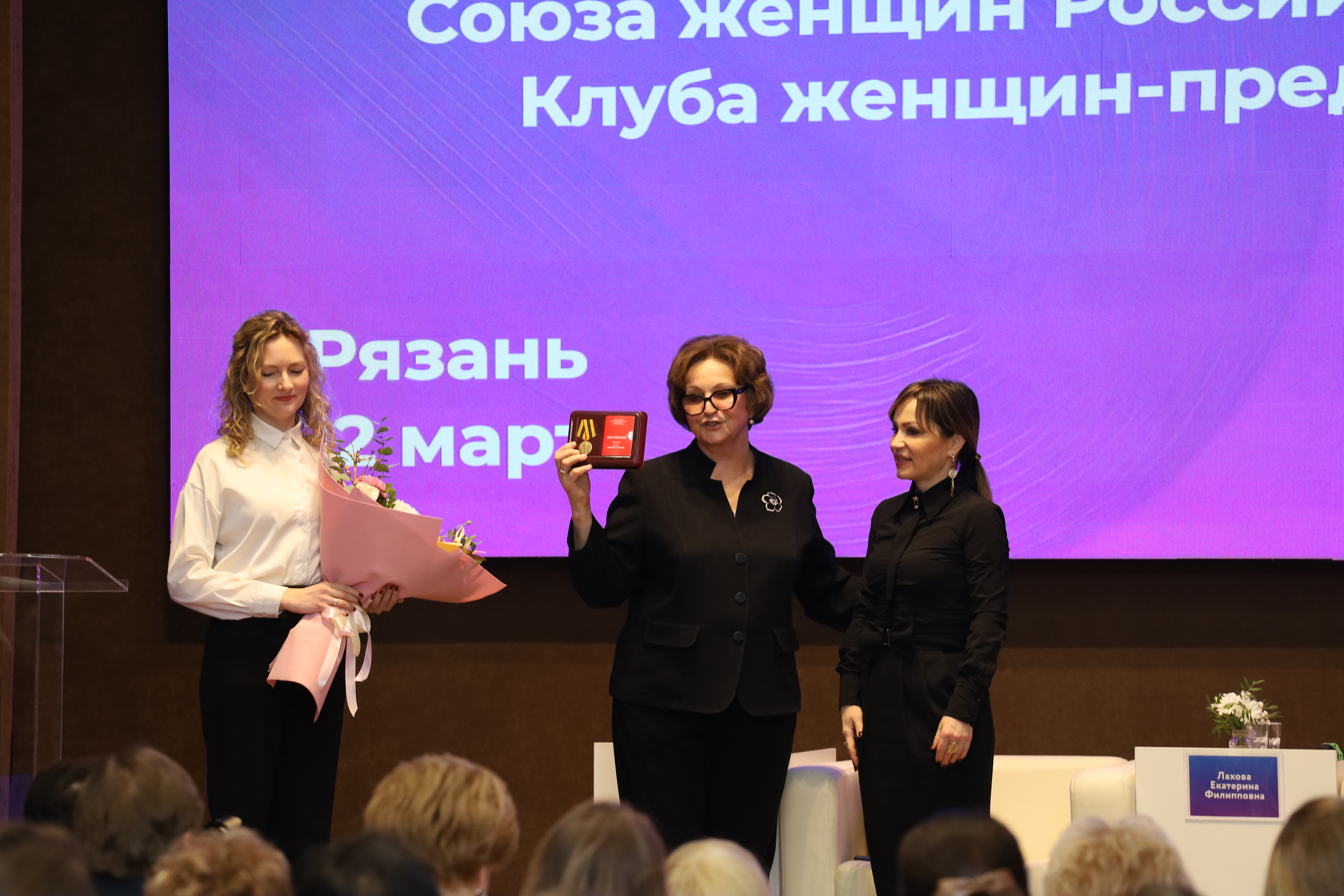 Екатерина Филипповна вручила заместителю председателя правительства Рязанской области Юлии Шваковой медаль Союза женщин России «Дочерям Отчизны».