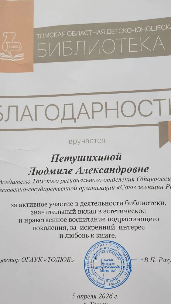 Людмила Петушихина, Ирина Грабцевич и директор Томской областной детско-юношеской библиотеки, член Правления РО СЖР- Валентина Разумнова вручили дипломы и почетные читательские билеты победителям, а также благодарственные письма педагогам и воспитателям.