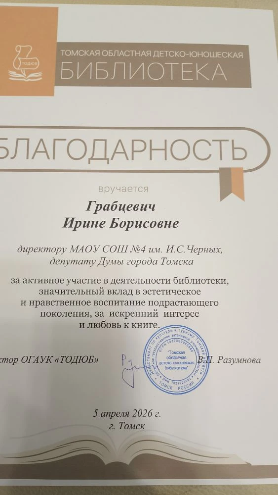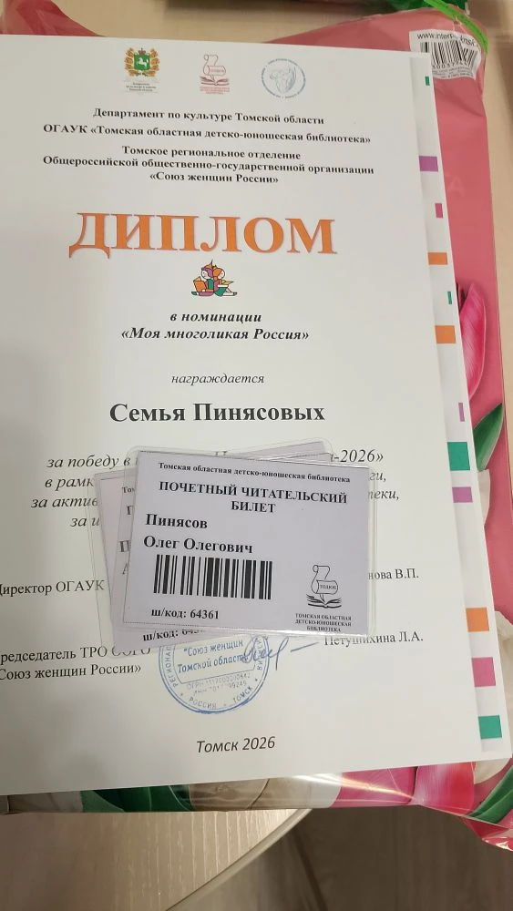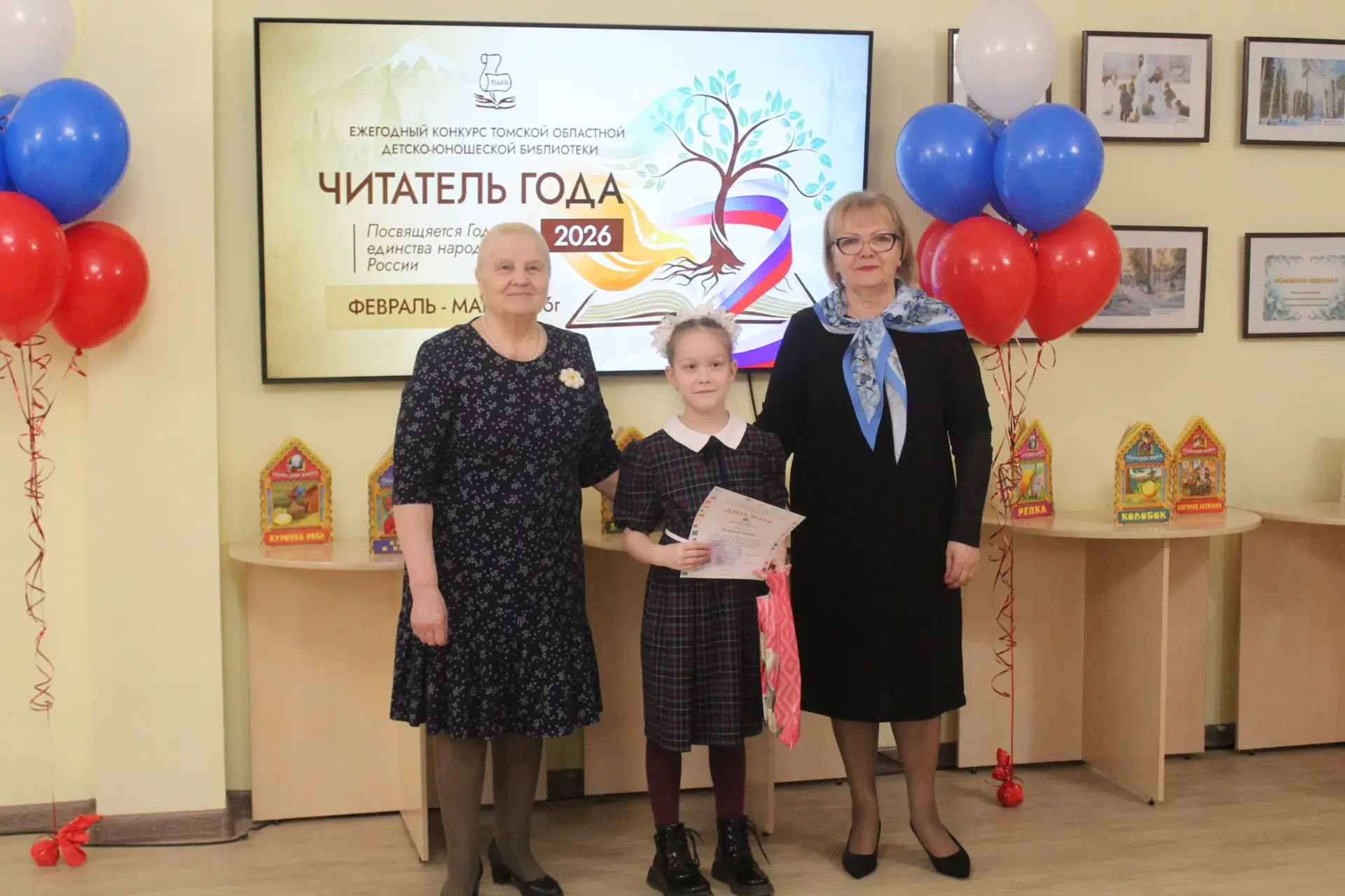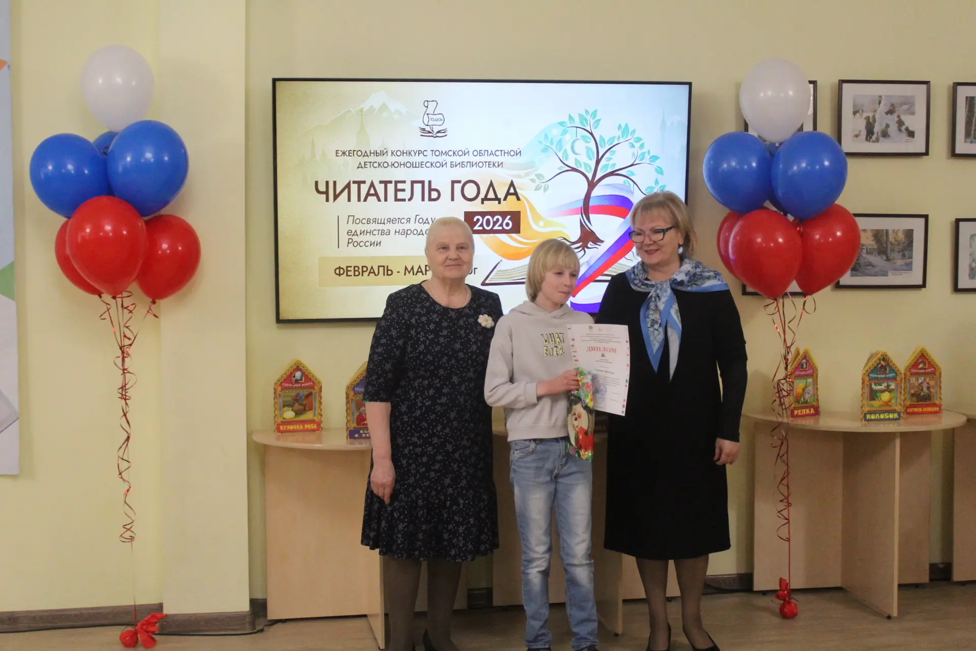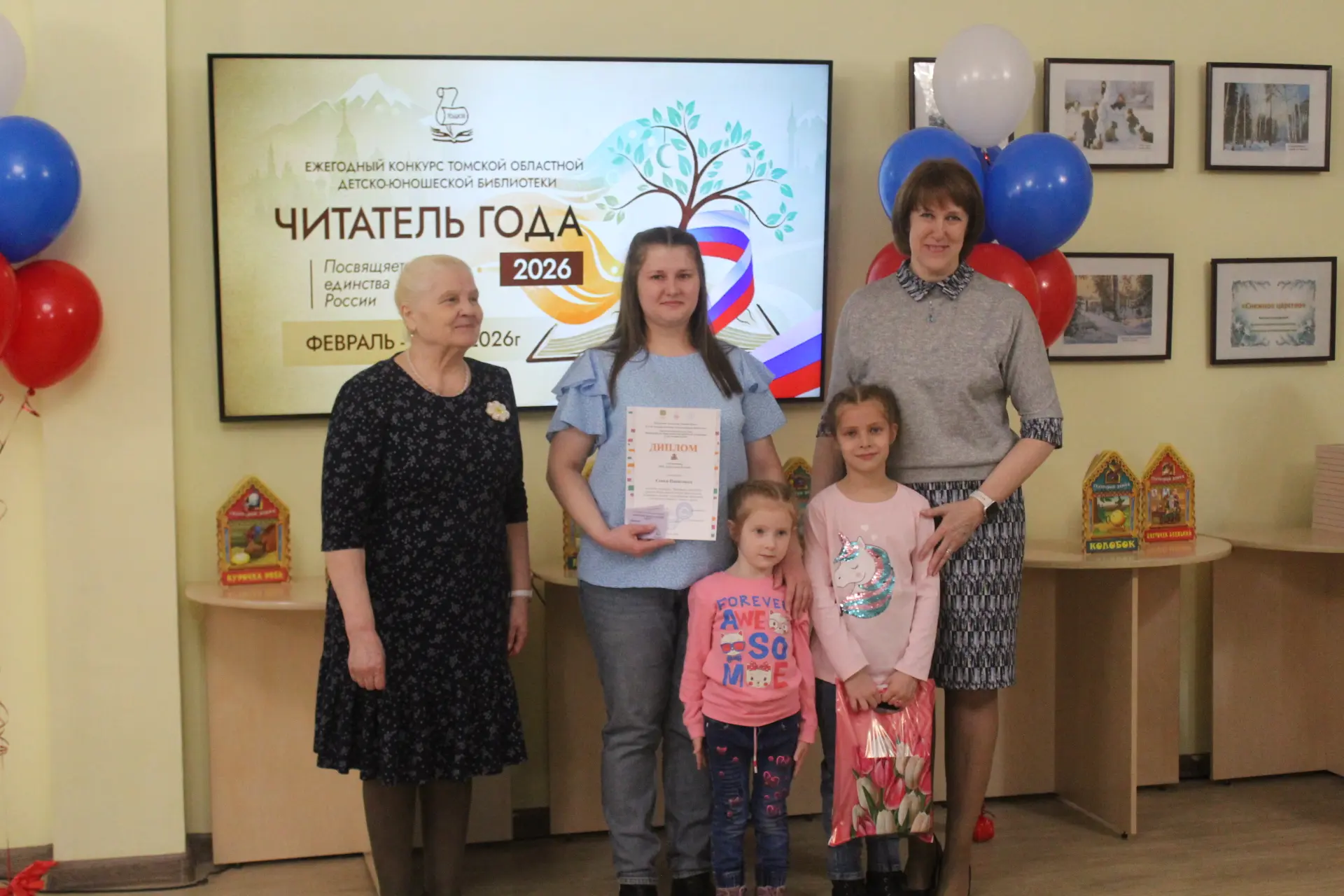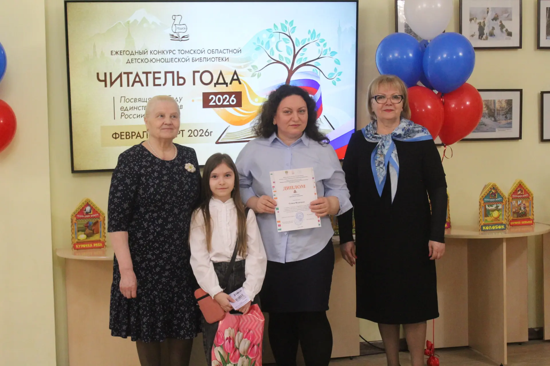 Кульминацией программы стало торжественное награждение победителей ежегодного конкурса «Читатель года», отметившее активных участников многочисленных мероприятий и конкурсов библиотеки. Учредители и организаторы конкурса: Департамент по культуре Томской области, Томская областная детско-юношеская библиотека и Томское региональное отделение Союза женщин России.