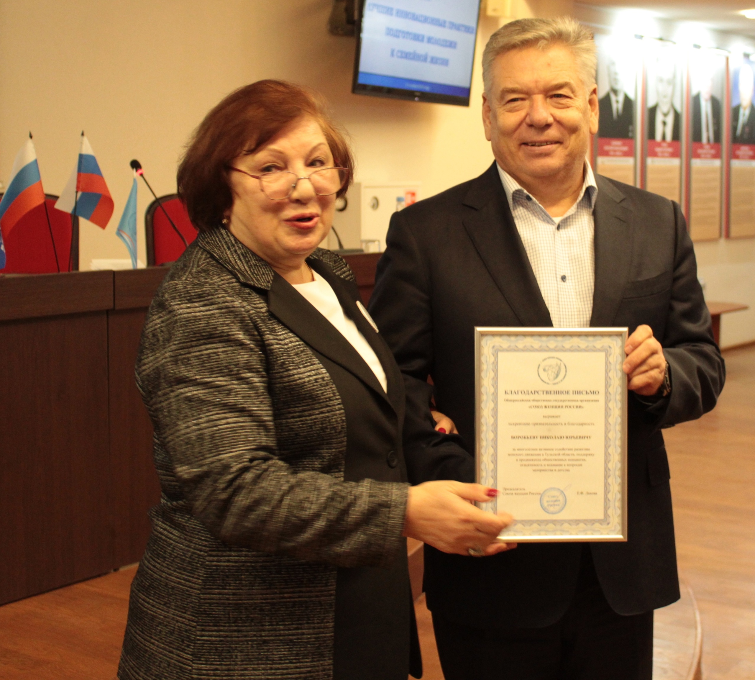 В свою очередь женщины-активистки во главе со своим лидером, региональным руководителем Союза женщин России Татьяной Лысенко, поблагодарили Николая Воробьева и Олега Иванова за тесное сотрудничество и помощь в решение многих вопросов и вручили им памятные подарки.