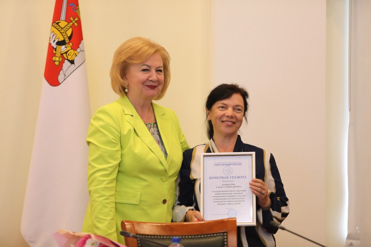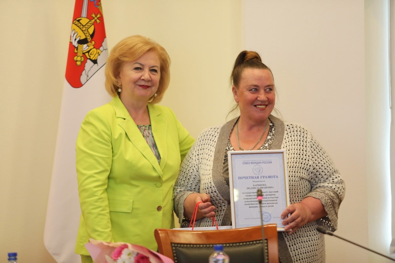 Почётные грамоты Союза женщин России вручены председателю Совета женщин Белозерского округа Елене Копыловой, депутату Вологодской городской Наталии Анчукова и предпринимателю Ирине Мироновой.