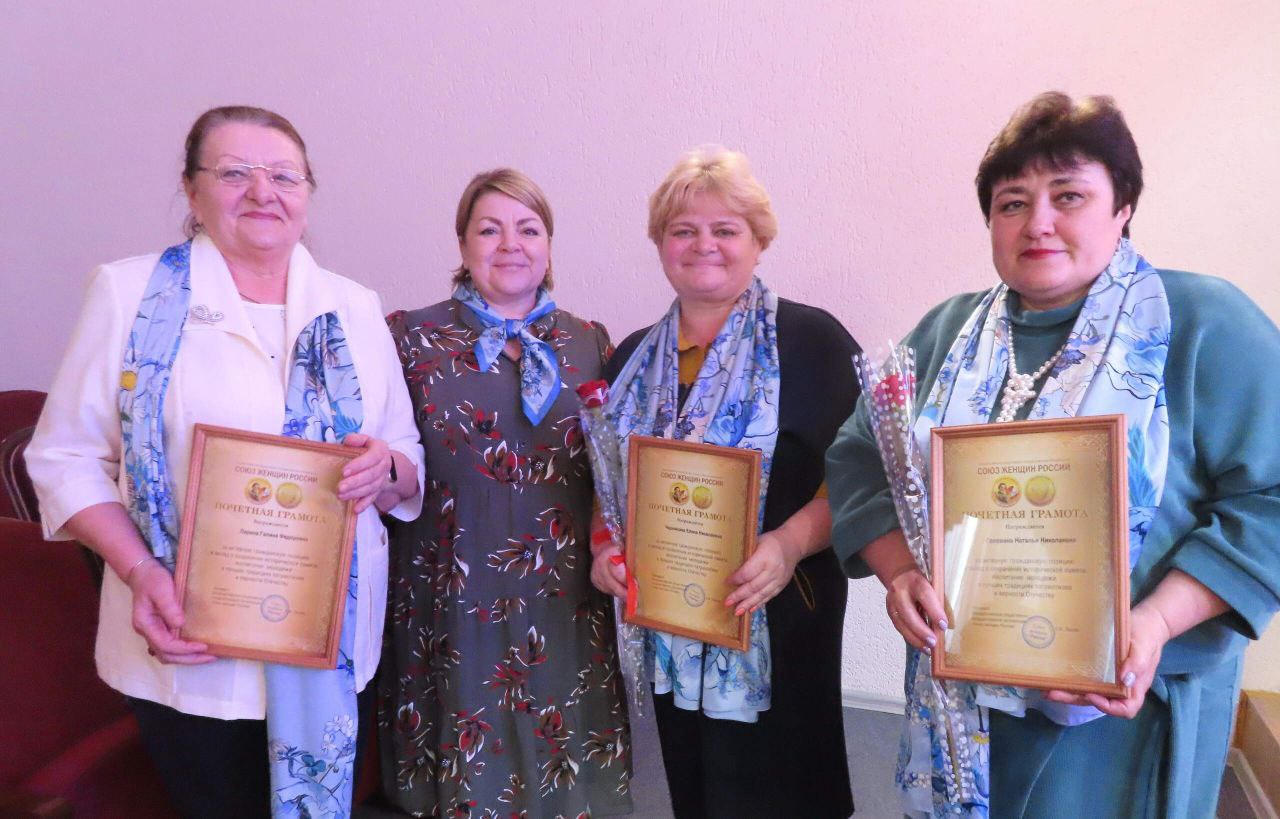 Почетной грамотой Союза женщин России за активную гражданскую позицию и вклад в сохранение исторической памяти, воспитание молодежи в лучших традициях патриотизма и верности Отечеству награждены Елена Черникова, Наталья Головина и Галина Ларина.