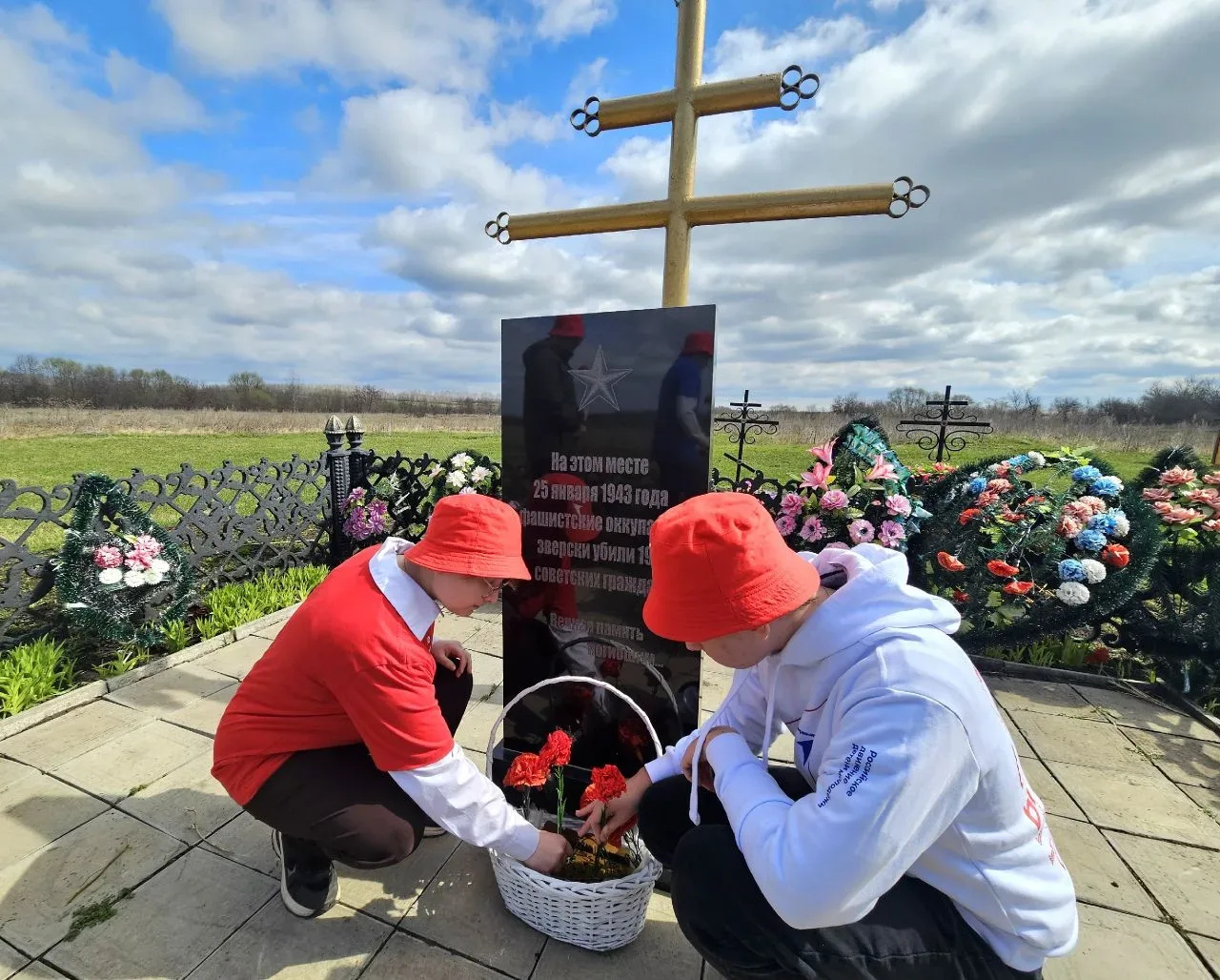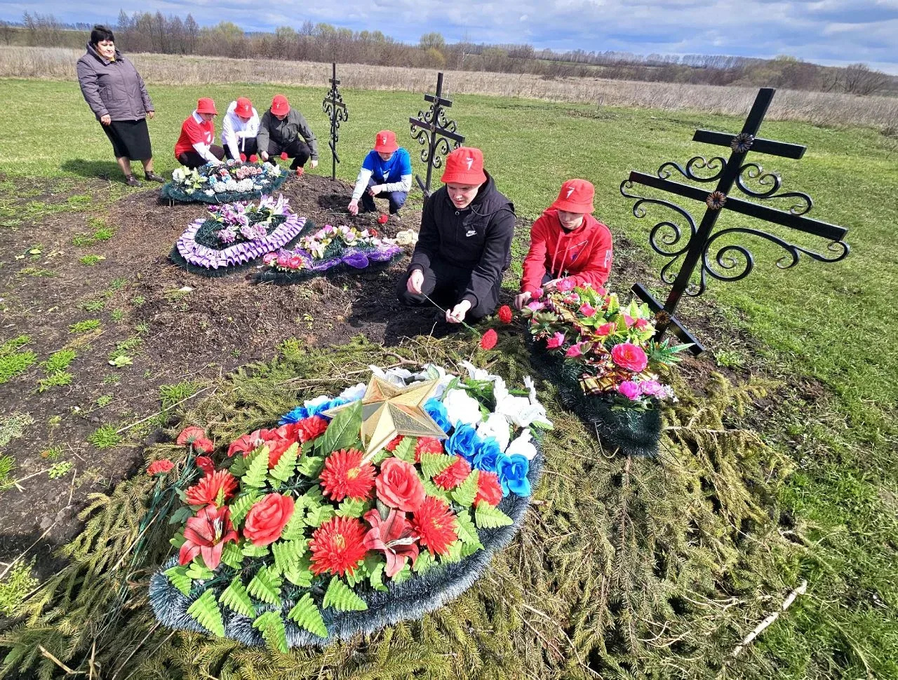 А со старшеклассниками - активистами "Движения Первых" наша подруга провела Урок мужества «Сроку давности не подлежит». Мероприятие проходило у памятника узникам Шатиловского фильтрационного лагеря в деревне Ивановка. В марте 2026 года здесь были захоронены останки, найденные летом 2025 года в ходе поисковых работ в рамках межрегиональной Вахты Памяти. Школьники почтили минутой молчания память погибших и возложили цветы к монументу.
