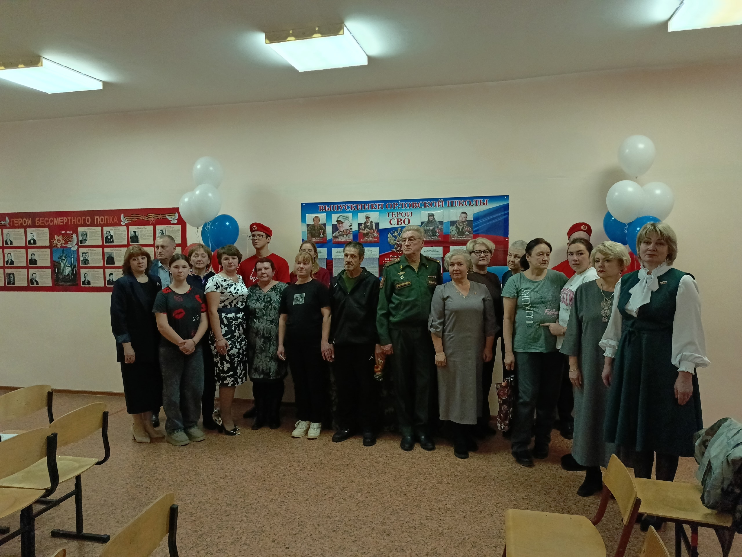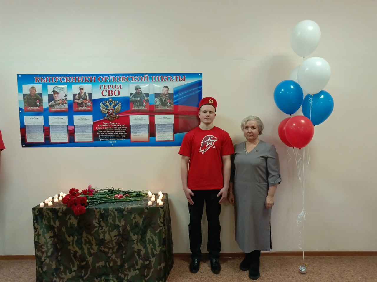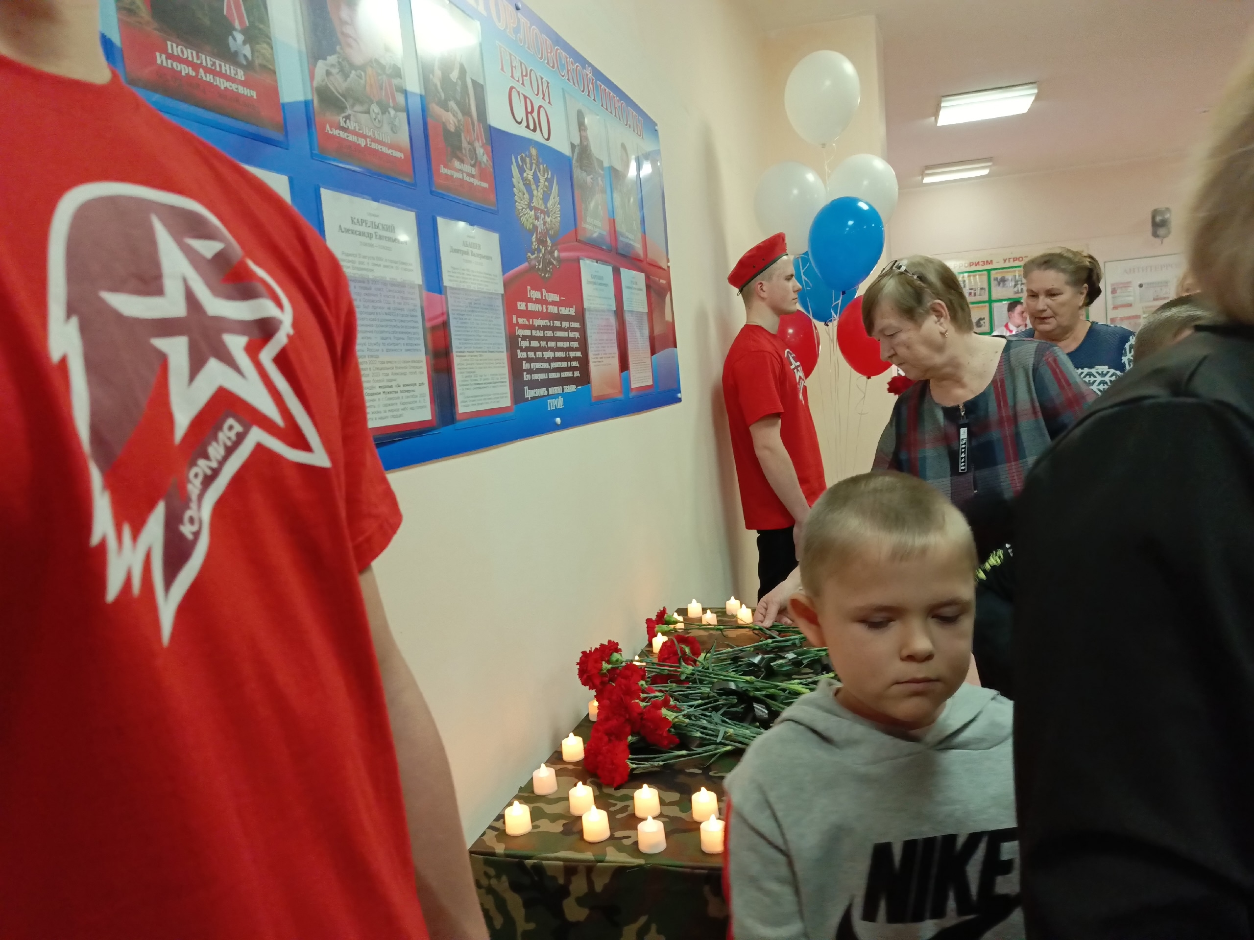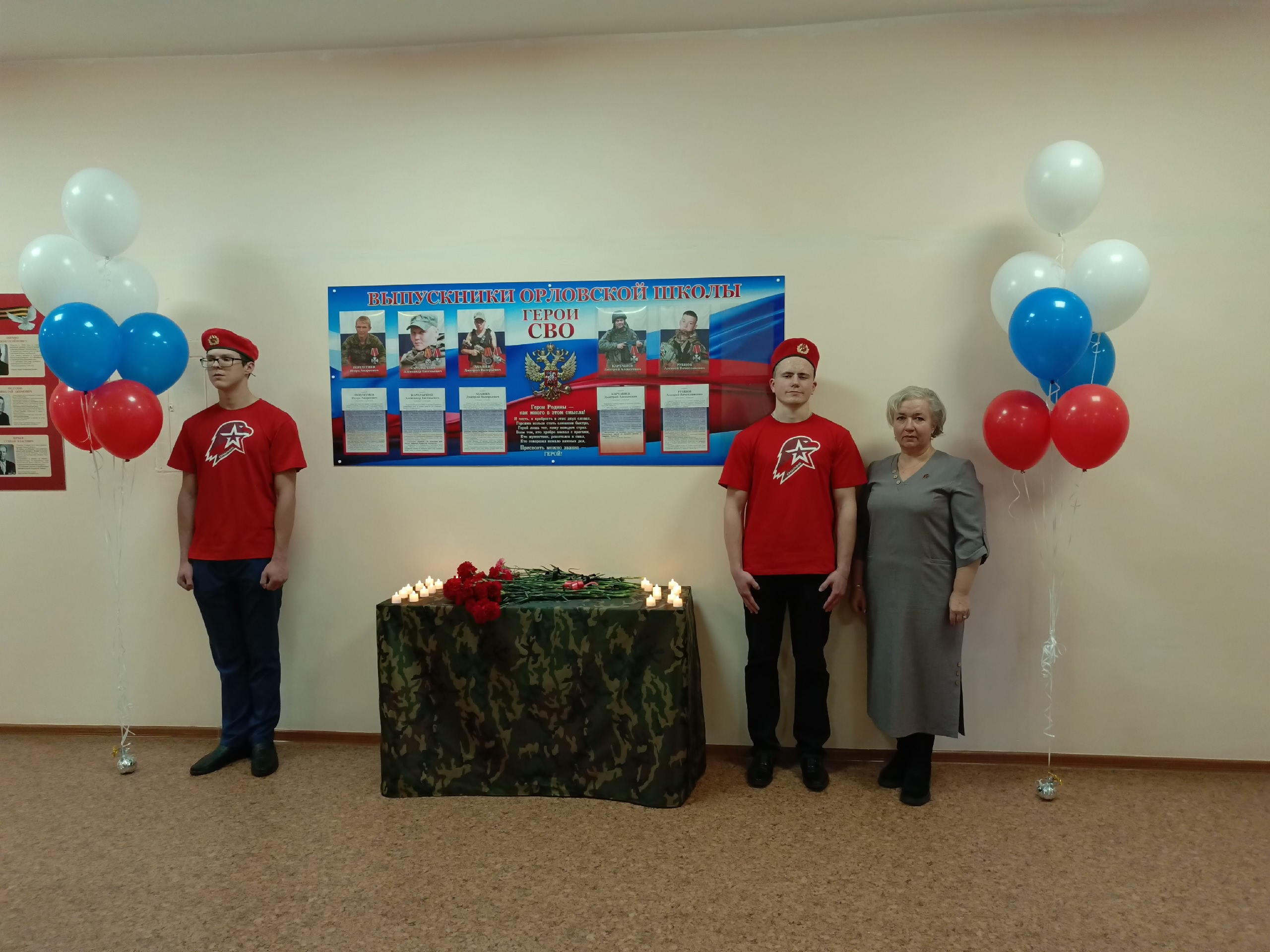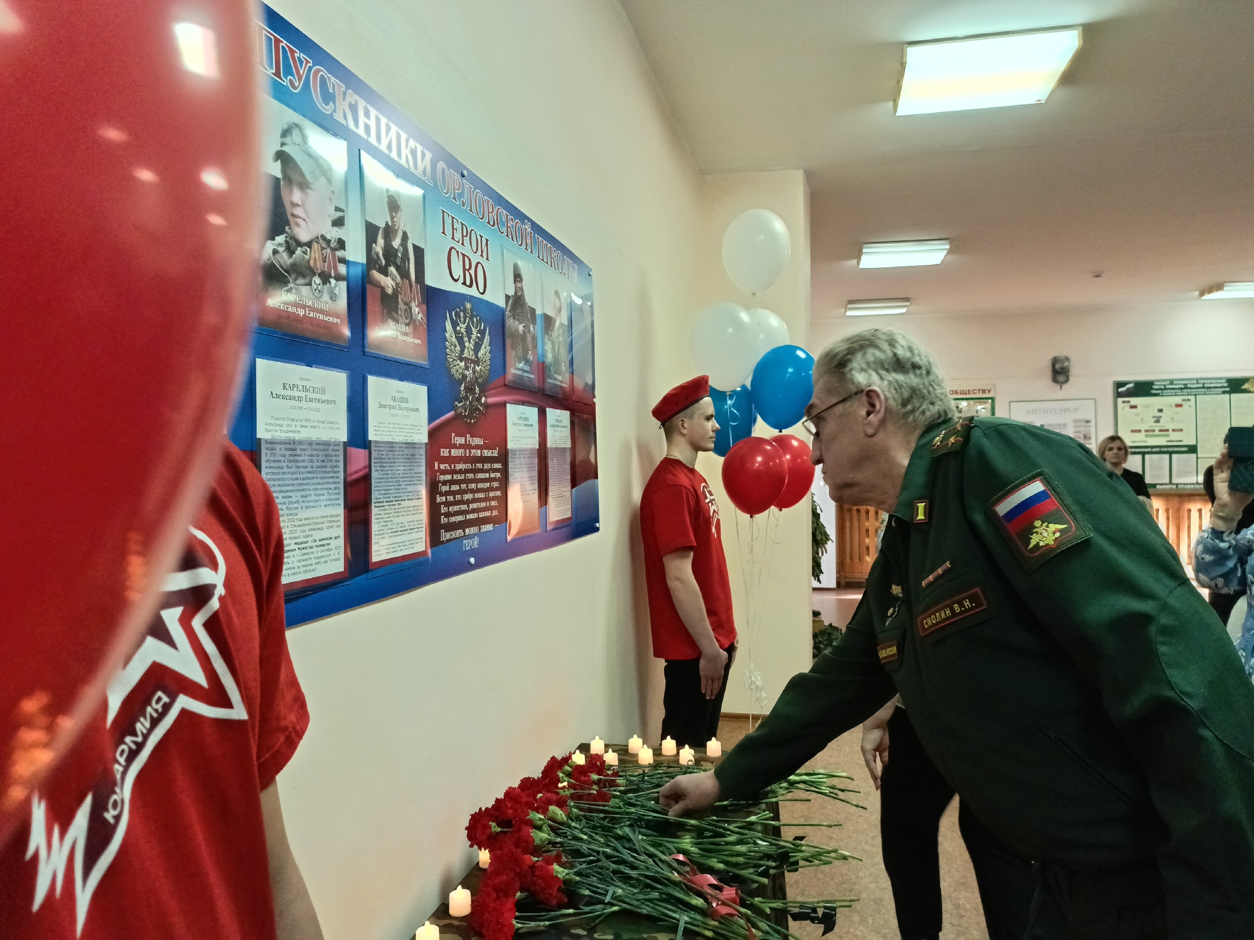 Учащиеся Орловской школы со сцены зачитали имена погибших ребят: Абашев Дмитрий Валерьевич, погиб 21 ноября 2023 года; Карельский Александр Евгеньевич, погиб 11 сентября 2023 года; Карташева Дмитрия Алексеевича, погиб 27 октября 2024 года; Поплетнёв Игорь Андреевич, погиб 20 августа 2023 года; Рубцов Алексей Вячеславович, погиб 15 августа 2025 года. Присутствующие почтили их память минутой молчания и возложили цветы к стенду.